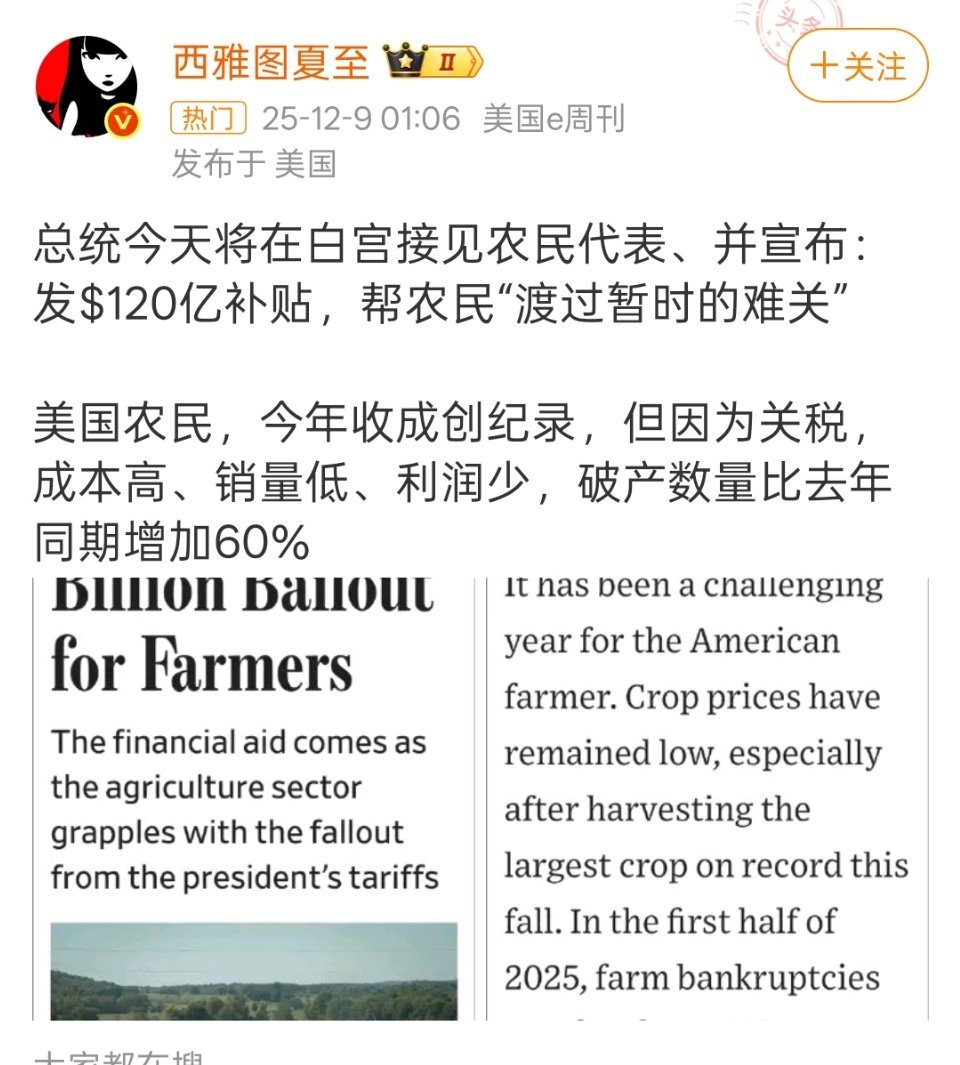 贸易战重创农民,特朗普宣布120亿美元农业援助,“帮农民度过暂时的难关”。
