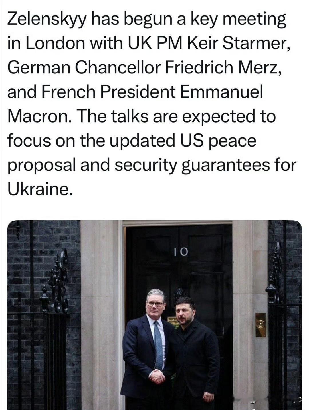 泽连斯基在伦敦向英法德三国首脑 汇报关于乌克兰和平计划与美国谈判结果的时候说: “美国对俄乌停战,有自己的想法,与我们不同…我们从法律上、道义上,都不能放弃领土…美国会继续卖武器给欧洲,因为符合他们自身利益 ​​​”。 泽连斯基的这番话,直接点明了乌克兰和美国在如何结束战争、各自追求什么利益上,存在根本性的分歧。 这场战争,对乌克兰是生死存亡的战争,对美国则是涉及重大经济和战略利益的博弈。乌克兰无法放弃领土主权,而美国则利用这场危机巩固自身地位。这种根本性的利益错位,决定了和平谈判将异常艰难,冲突可能长期持续。 这是泽连斯基为了获得欧洲的支持,在给欧洲三国通风报信,共同谋划对策。俄乌这场战争发展到今天,美国不仅把欧洲踢开,也把泽连斯基拿捏的有死有活。泽连斯基再也不是那个满世界都欠他的高傲债主,而是一个俯首帖耳的乞丐。现在唯一依靠的就欧洲那几个国家,但这几个国家也被特朗普拿捏的六神无主,一筹莫展。 如果欧洲大国继续支持乌克兰打下去,那么这场战争很可能还要持续下去。但打败俄罗斯几乎不可能,最后都被消耗的精疲力竭,各种不可预期的灾难性后果都有可能接踵而至。