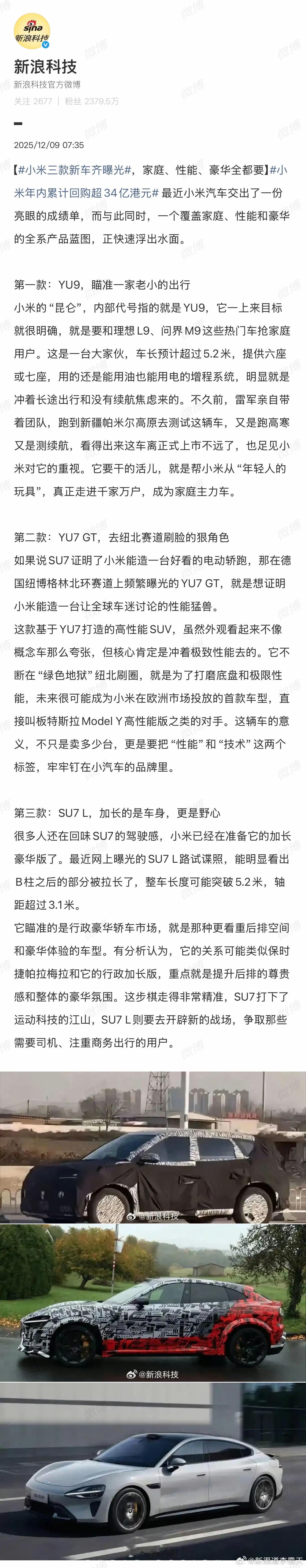 小米三款新车齐曝光新浪科技爆料小米三款新车(图2)- YU9:家庭旗舰 SUV,对标理想 L9和问界 M9- YU7 GT:高性能 SUV,预定刷纽北- SU7 L:5.2米 SU7,定位行政豪华感觉 SU7L 和 YU7 GT 都难以复现之前的成功,唯一比较值得期待的就是 YU9了。不管是第一次做增程,还是第一次切更成熟的大家庭用户,都对小米来说是新的挑战