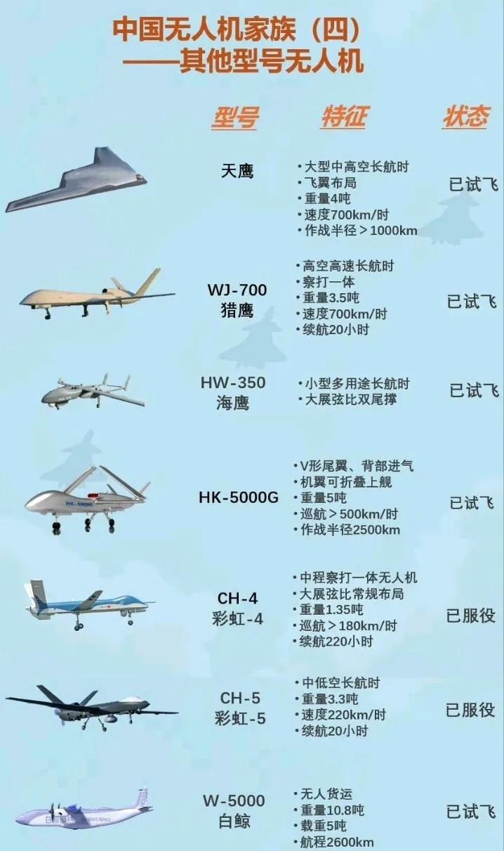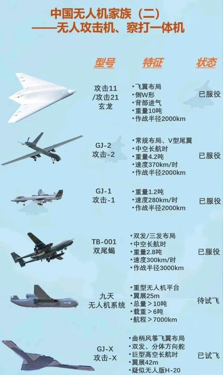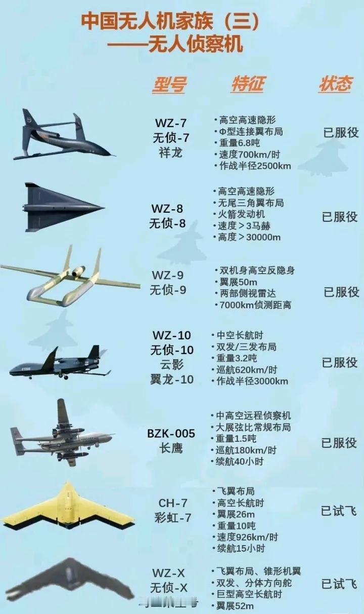 想不到我国的军用无人机已经发展到如此地步了! 提起中国军用无人机,别只知道翼龙、彩虹系列!咱们的军用无人机家族早就发展成了“分工明确、覆盖全域”的大家族,从高空侦察的“千里眼”到隐身突击的“刺客”,从单兵便携的“小能手”到航母适配的“海空卫士”,每个型号都有专属绝活。 察打一体这一派是军用无人机里的“明星梯队”,既能长时间盘旋侦察,发现目标还能立刻开火,不管是实战还是出口都口碑拉满。 ​ 翼龙系列堪称“外贸爆款担当”。翼龙-1作为基础款,早就出口到阿联酋等国,20小时续航能稳稳把控战场态势。翼龙-3更是升级成战略级狠角色,6.2吨的最大起飞重量,载重达2.3吨,续航超40小时,航程直接冲到1万公里,妥妥的“空中移动武器库”。还有翼龙-10,靠涡喷发动机实现620公里/小时的速度,隐身设计让它能悄悄执行纵深打击任务。 ​ 彩虹系列也是国际战场的“常客”。彩虹-4是爆款中的爆款,35小时续航能持续蹲守目标,在中东反恐战场屡立战功;彩虹-5更猛,载重1吨能挂16枚导弹,对付地面工事绰绰有余。彩虹-7则走高端隐身路线,13吨的最大起飞重量搭配1.08万公里航程,专门负责隐身突防侦察,未来战场潜力十足。 ​ 攻击系列是解放军的“本土战力担当”。攻击-2是首款装涡轮螺旋桨发动机的无人机,20.5米翼展搭配6个武器挂架,能在9000米高空对战场重点区域持续监视打击 。攻击-11(玄龙)更是全球首款实战部署的隐身飞翼无人机,雷达反射面积比麻雀还小,2吨载弹量能执行制空突击任务,还能跟歼-20组队当“忠诚僚机”。攻击-21作为舰载版,适配福建舰和076型两栖攻击舰,专门强化海空作战能力。 ​ 双尾蝎系列更是无人机里的“多面手”。双尾蝎D是全球首款四发无人机,4.3吨的最大起飞重量带5立方米货舱,既能挂弹打击,又能执行空运空投任务,35个小时续航时间能应对多种复杂任务。 ​ 无侦系列是侦察领域的“顶梁柱”。无侦-5是咱们自研首款高空无人侦察机,靠母机投放、降落伞回收,当年填补了高空侦察空白 。无侦-7能自由跨越民航航线,菱形联翼布局让它能在2万米高空执行战略侦察。无侦-8更是“速度王者”,靠火箭发动机实现6 - 7马赫速度,能冲到5万米高空,敌方防空网根本拦不住。无侦-10专做电子侦察,能侦收定位敌方雷达信号,还能释放48架蜂群无人机,构建200公里的侦察网络。 ​ 神雕无人机外形超独特的双机身设计,翼展达50米,起飞重量15 - 20吨。它的绝活是反隐身预警,能探测到500公里外的隐身战机,相当于给国土防空装了个“超远距雷达”。 ​ BZK - 005更是台海方向的“常客”,8000米升限搭配40小时续航,能持续执行中高空侦察任务,为战术决策提供实时情报。 ​ ​ 九天无人机更是妥妥的“蜂群母舰” 。25米翼展搭配16吨最大起飞重量,机腹有异构蜂巢任务舱,能携带120 - 200架微型无人机,换个模块就能实现火力打击、信息支援等多种任务,堪称空中作战“调度中心”。 ​ 还有飞龙巡飞弹家族,这是自杀式无人机的代表 。飞龙-10是单兵款,专门打击几公里内的人员和无防护目标;飞龙-60能打百公里内的地面工事和水面舰船,还能跟火箭炮组网,形成智能打击战队。 ​ 旋戈500是无人直升机里的“多面手”。600公斤最大起飞重量搭配8小时续航,能在复杂地形执行侦察、物资投送任务,不管是高原还是海岛都能派上用场。 我们如今无人机的型号太多了,从早期仿制的无侦-5,到如今全球领先的攻击-11、翼龙-3等等,中国军用无人机每个型号的迭代,都是战力的一次跃升。这些型号覆盖了从单兵战术到战略打击的全场景,既能单打独斗显神通,又能组队协同形成体系战力,这就是现在很多国家都抢着要的实力背书。 晒图笔记大赛