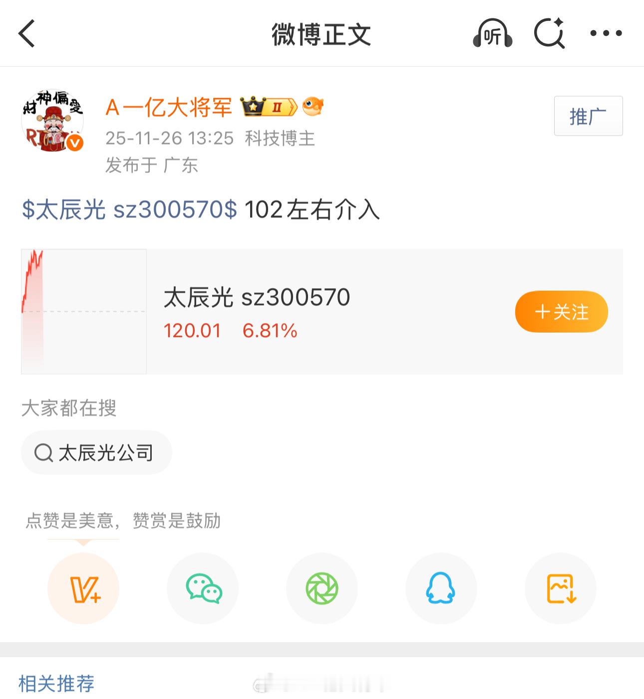 漂亮,我提示的$太辰光 sz300570$ ,102进去的,目前拉升133了盈利20点以上了