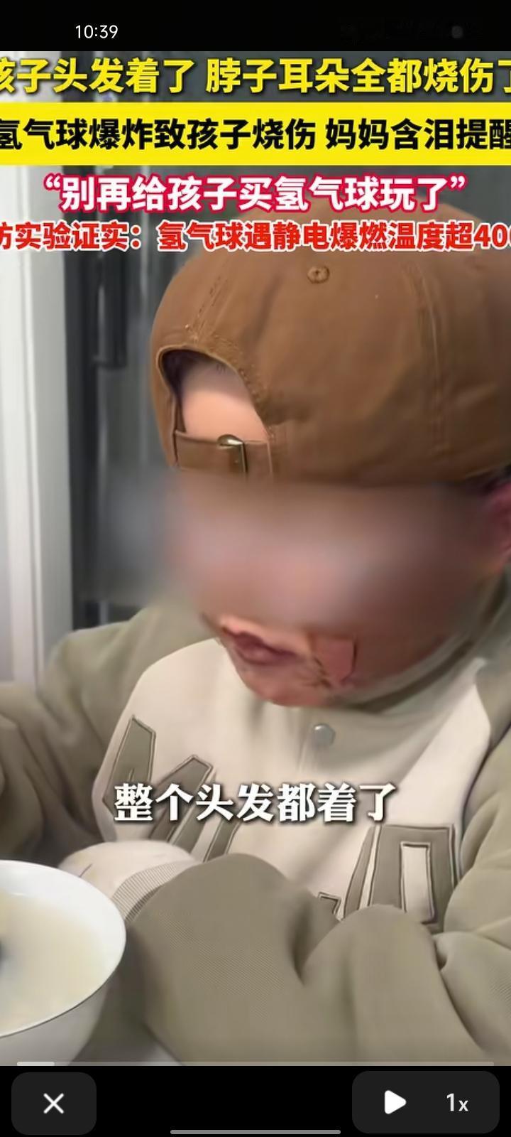 12月6日,河南平顶山。孩子妈妈发视频称,孩子因氢气球爆炸致头发被烧着,脸、手、脖子和耳朵大面积烧伤,目前正在治疗康复中。看着既心疼又自责,怪自己的安全意识太差,让孩子遭这么大的罪,提醒大家不要给孩子买氢气球玩了。 我觉得这位妈妈的提醒很有必要,尤其是在节日、集市等场合,很多家长随手给孩子买个氢气球玩,却没意识到潜在的危险。要是买到了氢气球,避免火源、热源和摩擦产生的静电就行。