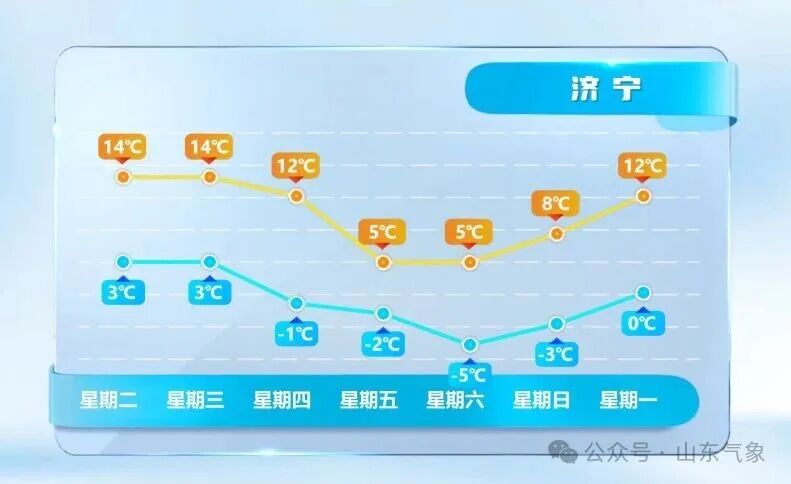 降温:10日夜间到13日,我省气温持续下降,最低气温降温幅度8℃左右,14日早晨气温降至最低,鲁西北和鲁中山区-10~-8℃,沿海地区-4~-1℃,其他地区-7~-5℃。
