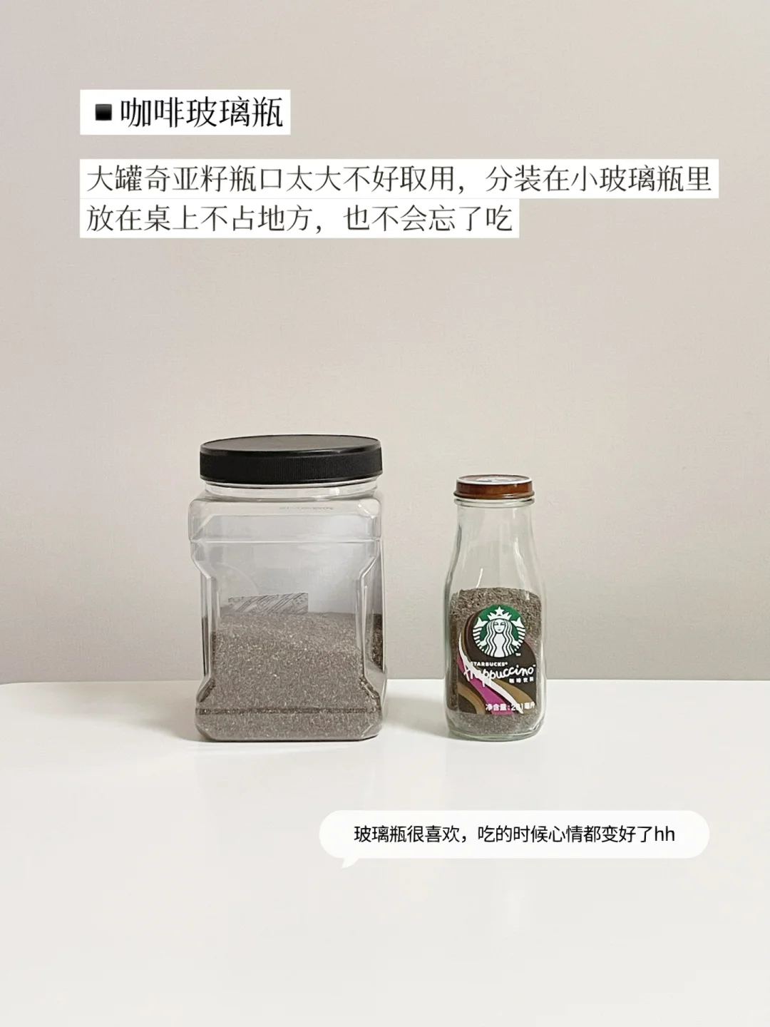 大罐奇亚籽瓶口太大不好取用,分装在小玻璃瓶里。放在桌上不占地方,也不会忘了吃