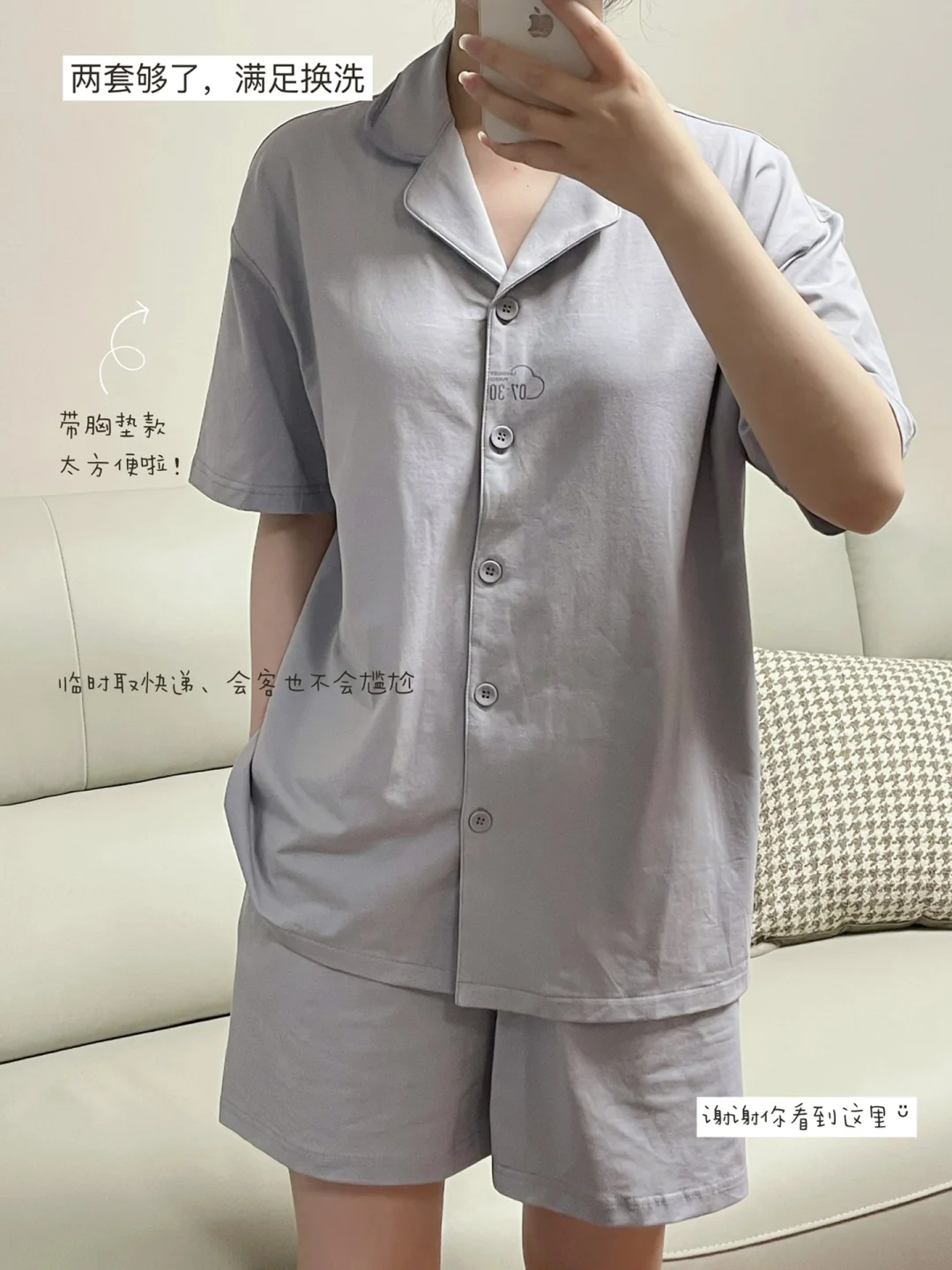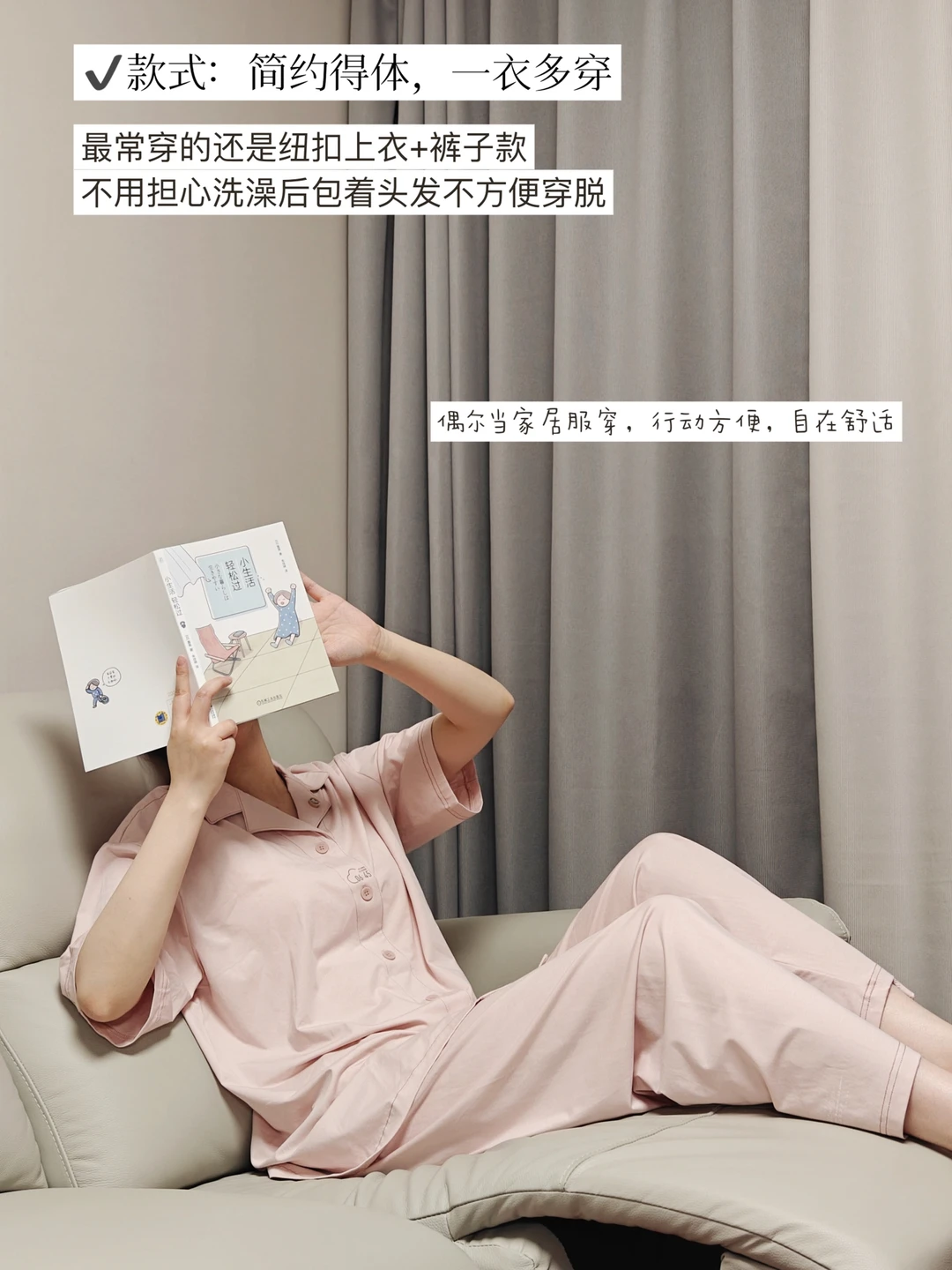最常穿的还是纽扣上衣+裤子款,不用担心洗澡后包着头发不方便穿脱。静韵带胸垫睡衣偶尔当家居服穿,做家务或临时拿外卖/快递也方便