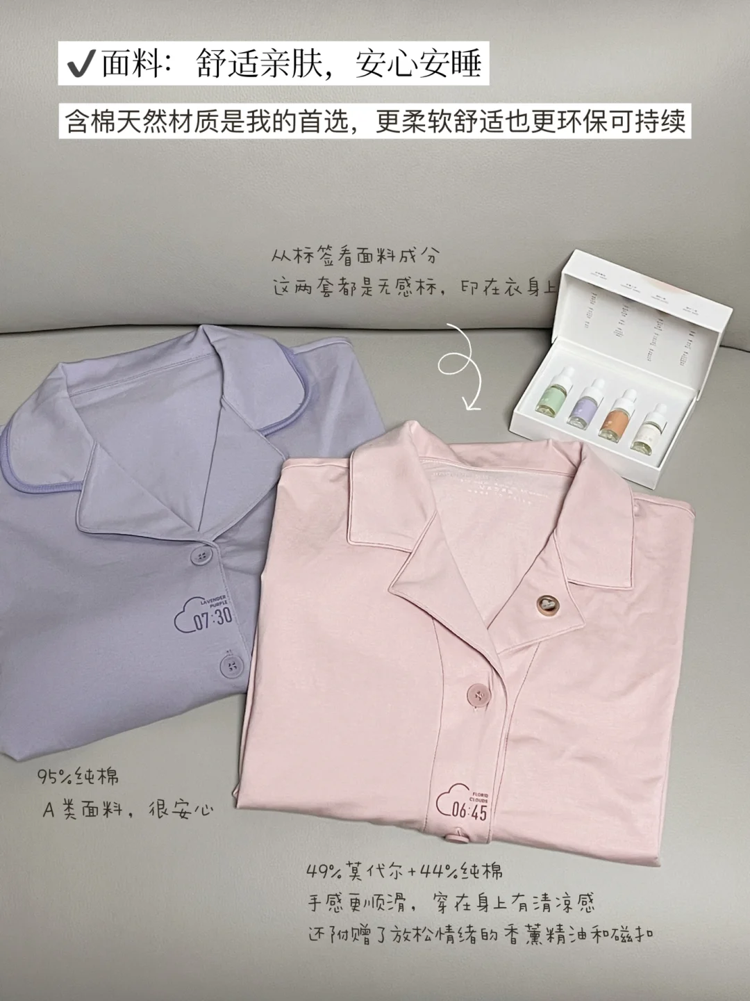 含棉天然材质是我的首选,更柔软舒适也更环保可持续。目前的两套睡衣,一套是49%莫代尔+44%纯棉,一套是95%纯棉,贴身有微凉感。静韵香香睡衣还配置了香薰磁扣,滴上附赠的精油,贴在衣领上,安神舒眠