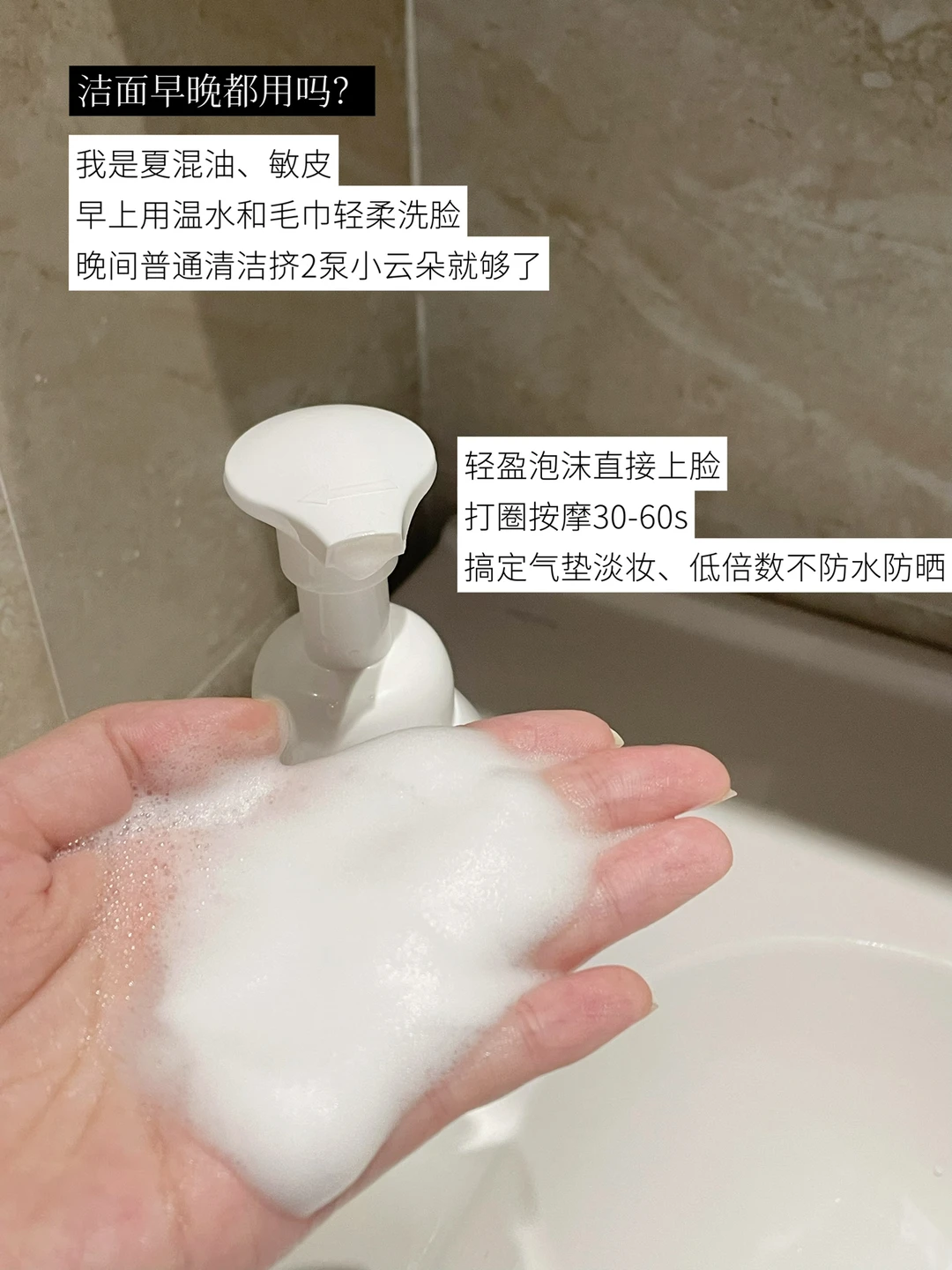 我的做法是早上用温水和毛巾轻柔洗脸,晚间普通清洁挤2泵小云朵洁面就够