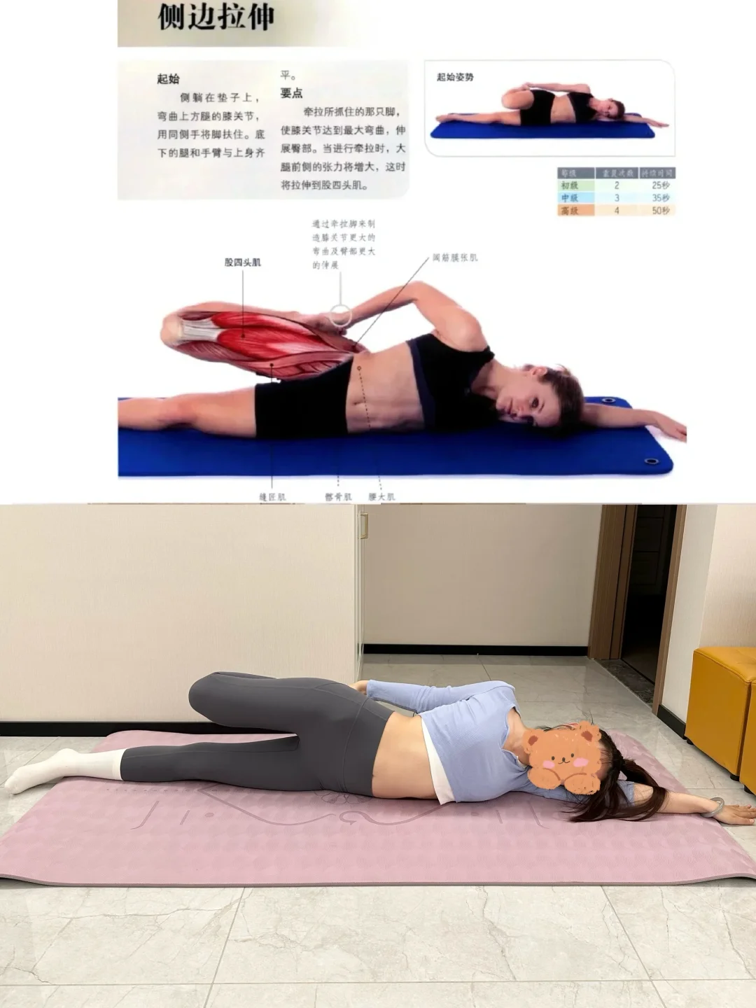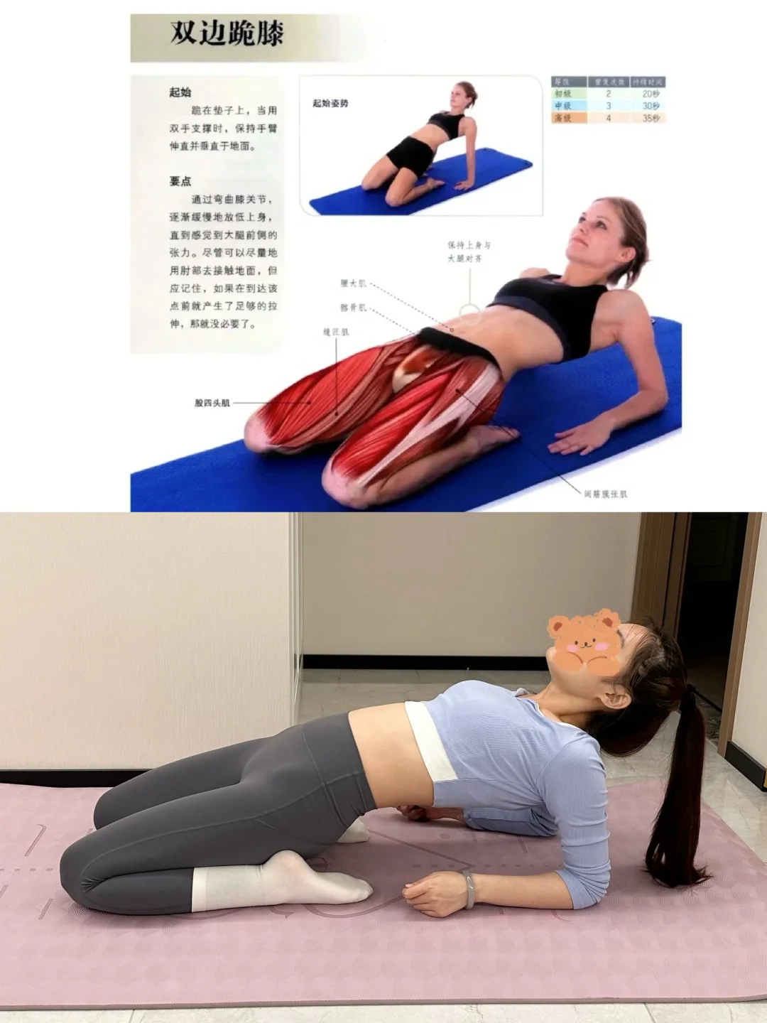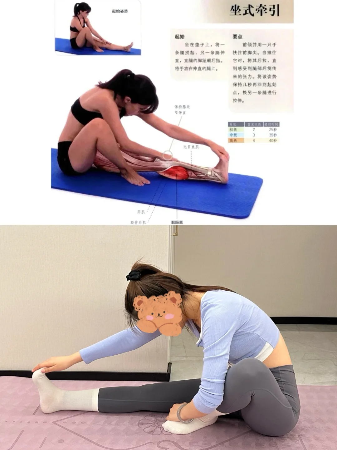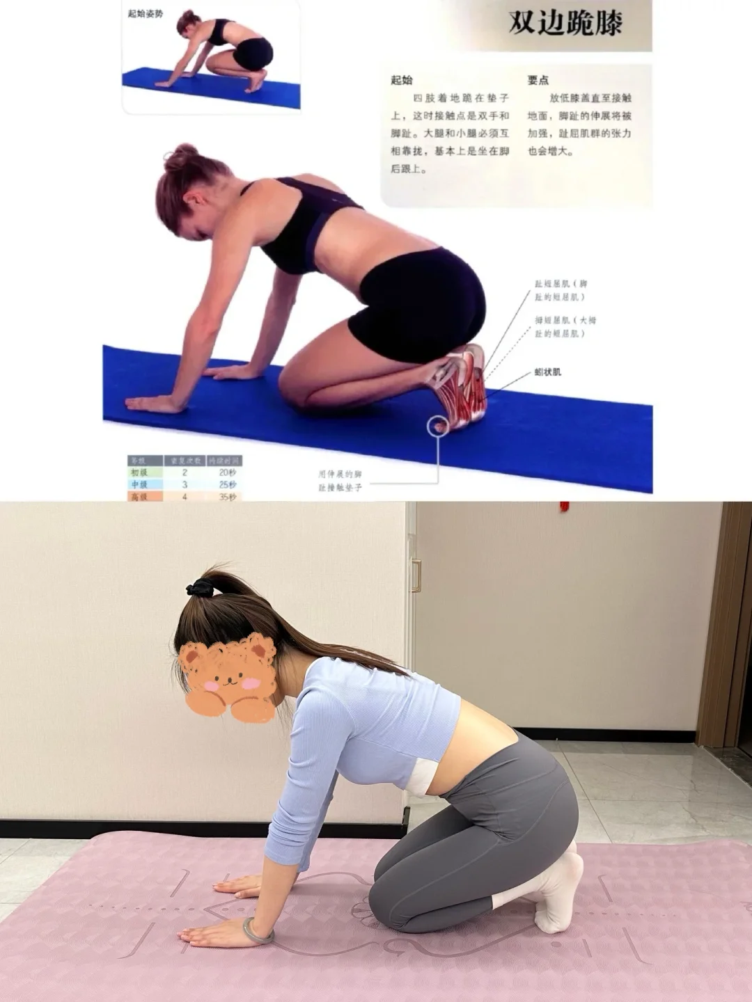 姐妹们!这组腿部拉伸动作忒简单了,没有基础的也可以轻松做到,肌肉腿,脂包肌,小腿外翻的要每天坚持哦~ ①动作一:双边跪膝 ②动作二:侧边拉伸 ③动作三:膝关节静靠 ④动作四:仰卧抬腿 ⑤动作五:坐式牵引 ⑥动作六:双边跪地 每个动作保持40-60s,2组