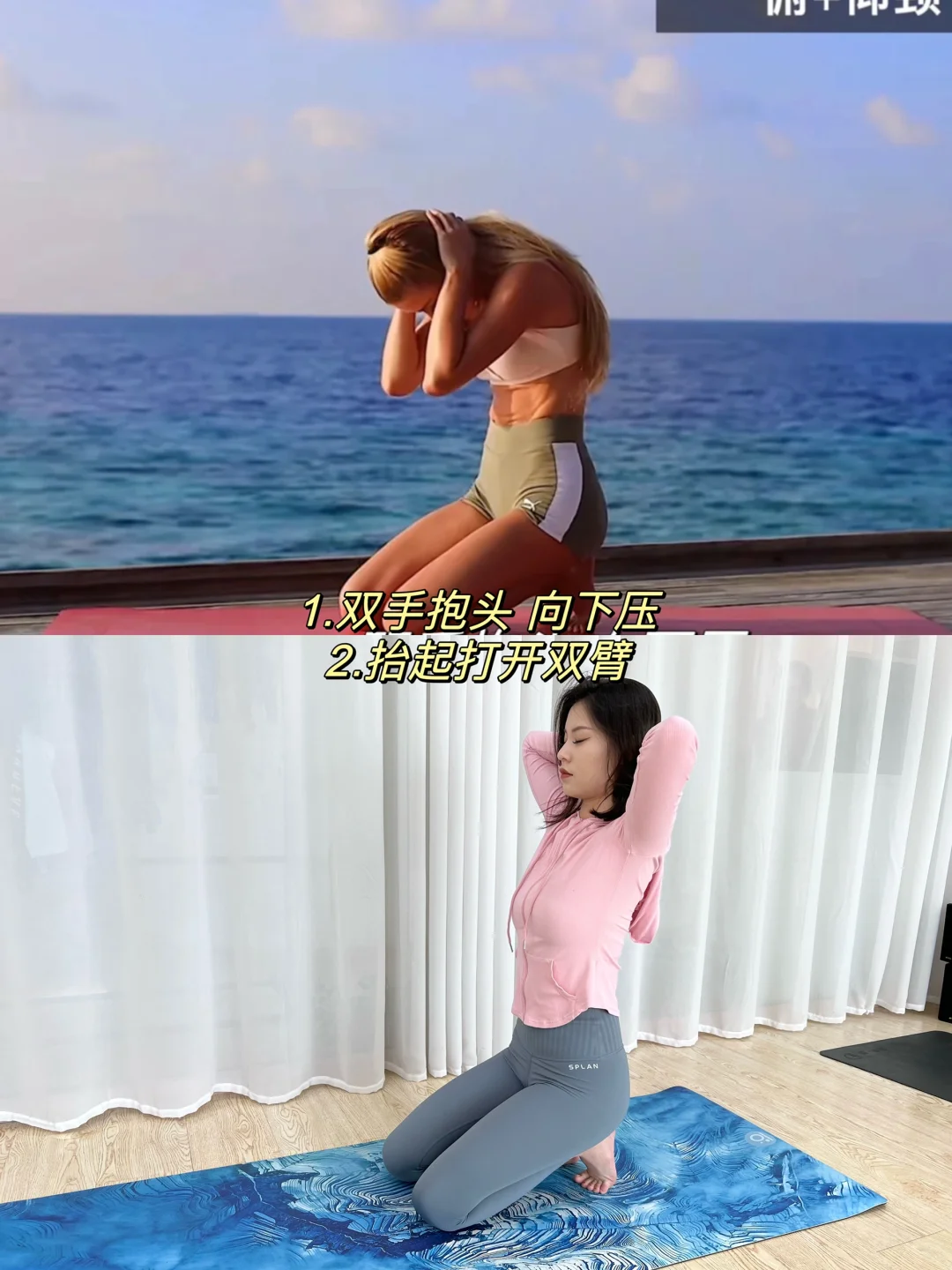 双手抱头,向下压,然后抬起打开双臂