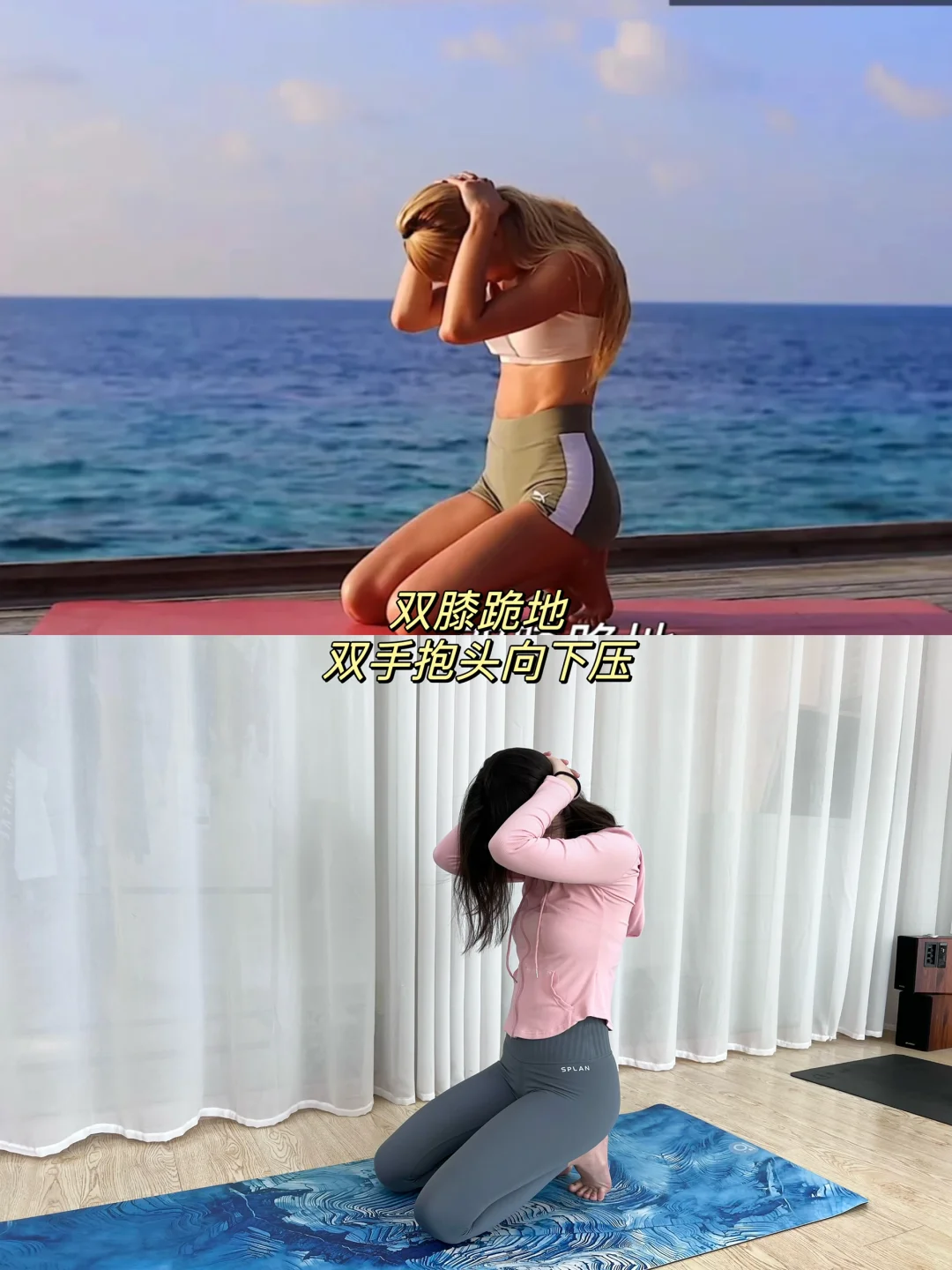 双膝跪地,双手抱头,向下压