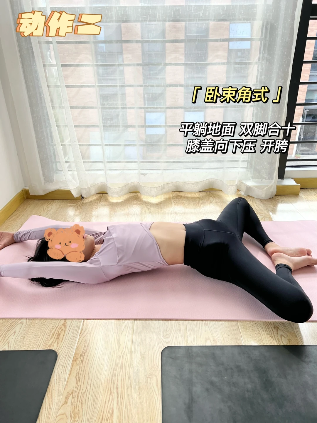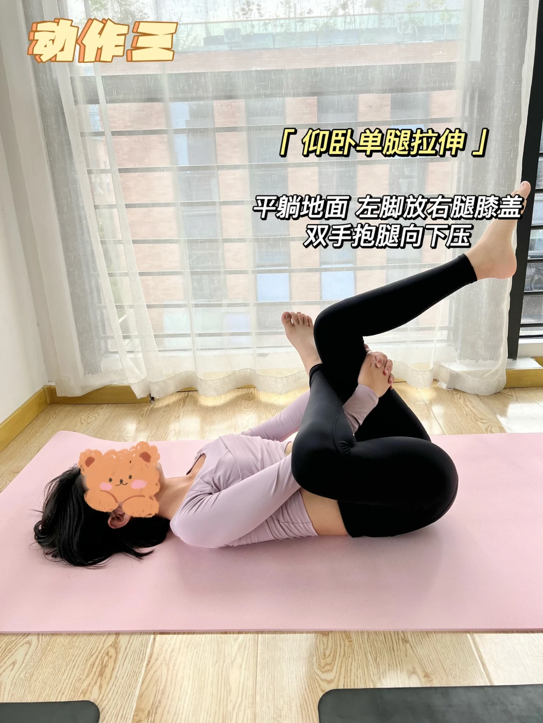不仅改善骨盆前倾,还可以拉伸大腿后侧! 动作一:仰卧抱膝腰背贴实地面大腿靠近胸口抱腿 动作二:卧束角式平躺地面双脚合十,膝盖向下压开胯 动作三:仰卧单腿拉伸平躺地面右脚放左腿膝盖,双手抱腿向下压 ★每个动作保持两分钟(循序渐进)