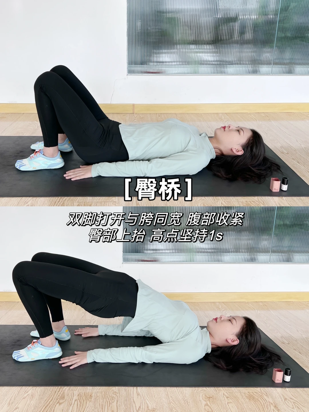动作一:50下*2组(平躺地面,核心收紧,骨盆向上抬坚持1s再落下)
