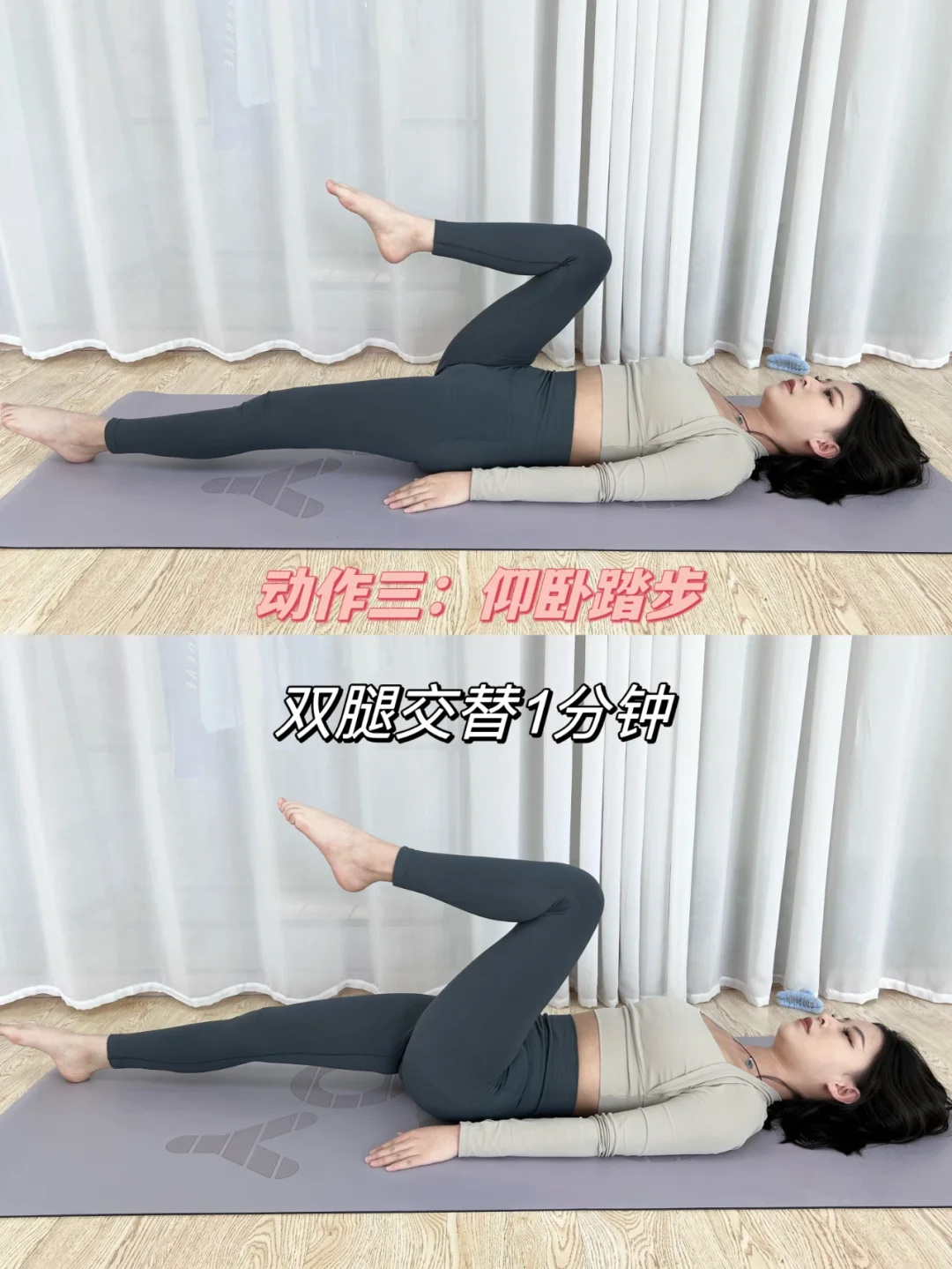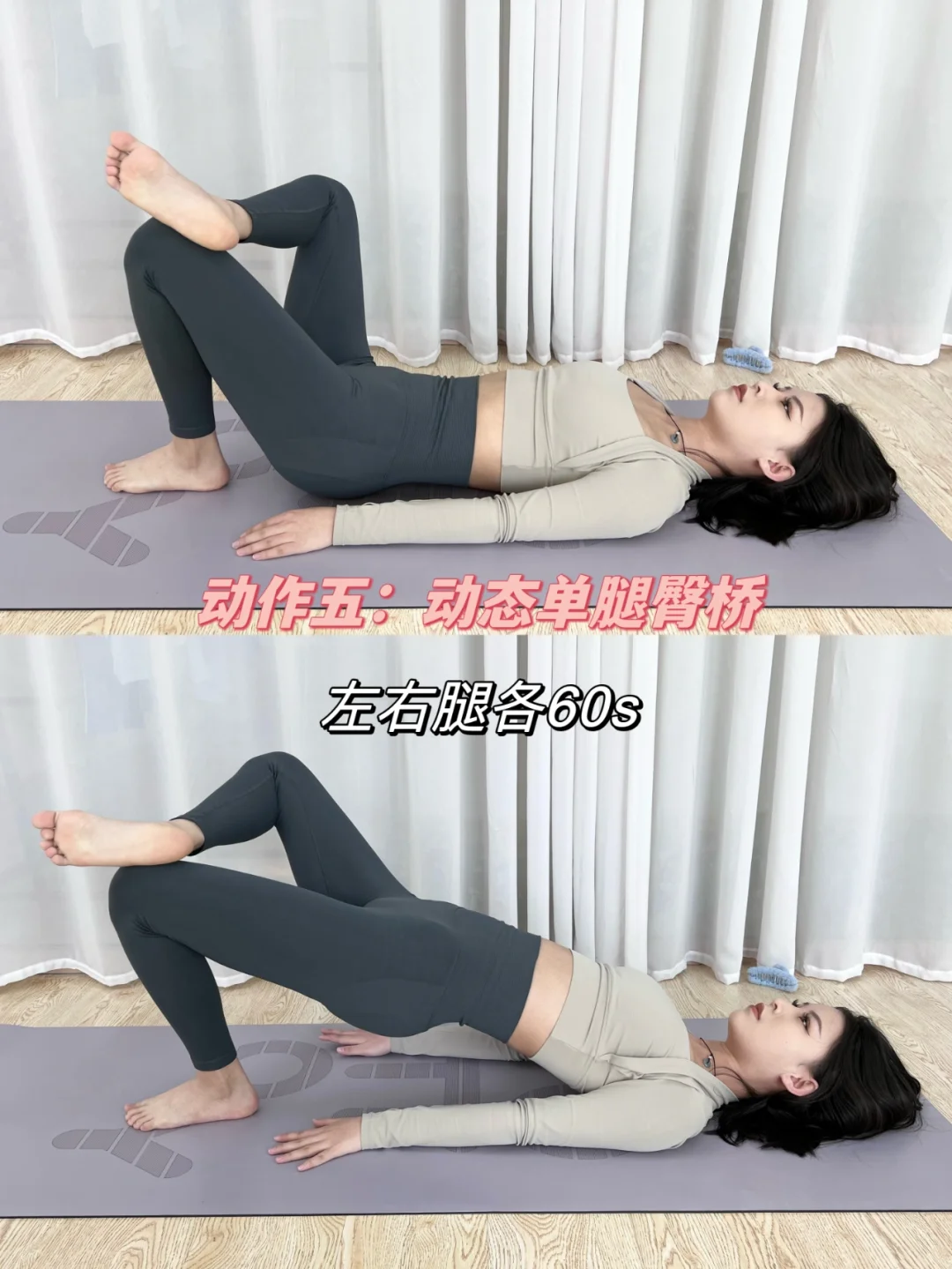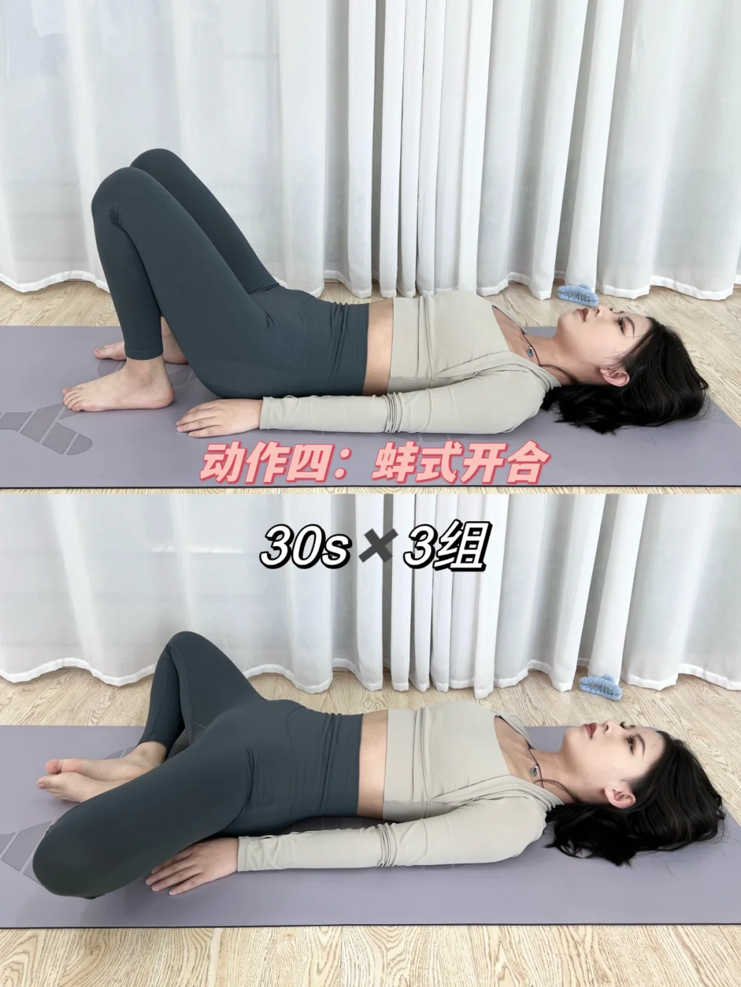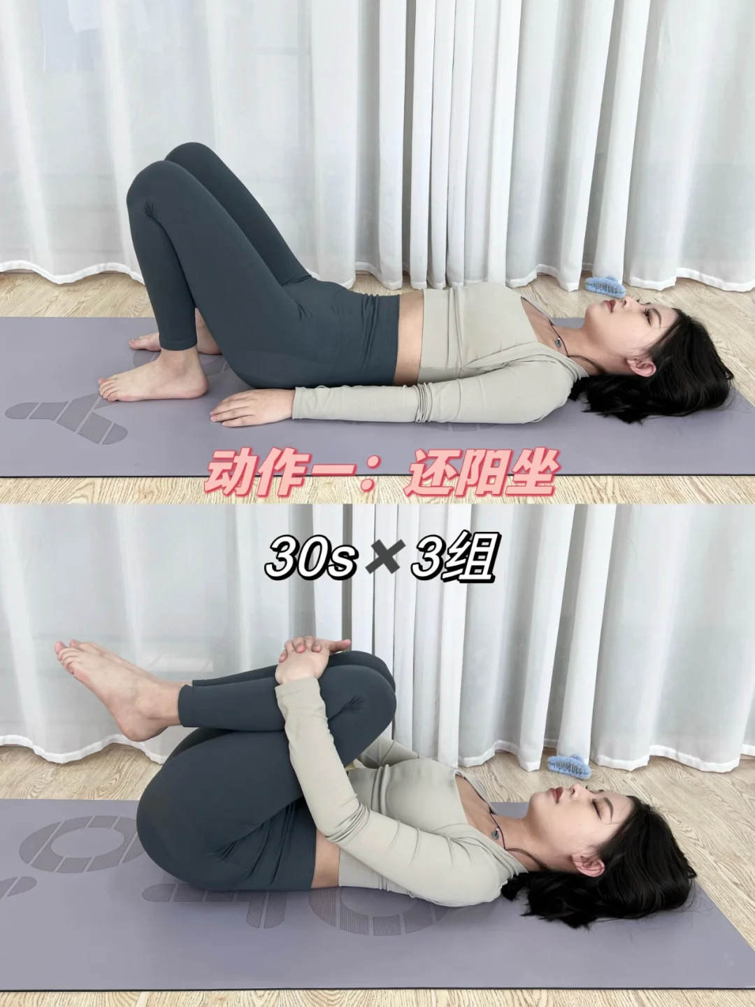 动作一:还阳坐,保持30s*3组; 动作二:卧式拉伸,保持30s*3组; 动作三:仰卧踏步,双腿交替1分钟; 动作四:蚌式开合,保持30s*3组; 动作五:动态单腿臀桥,左右腿各1分钟