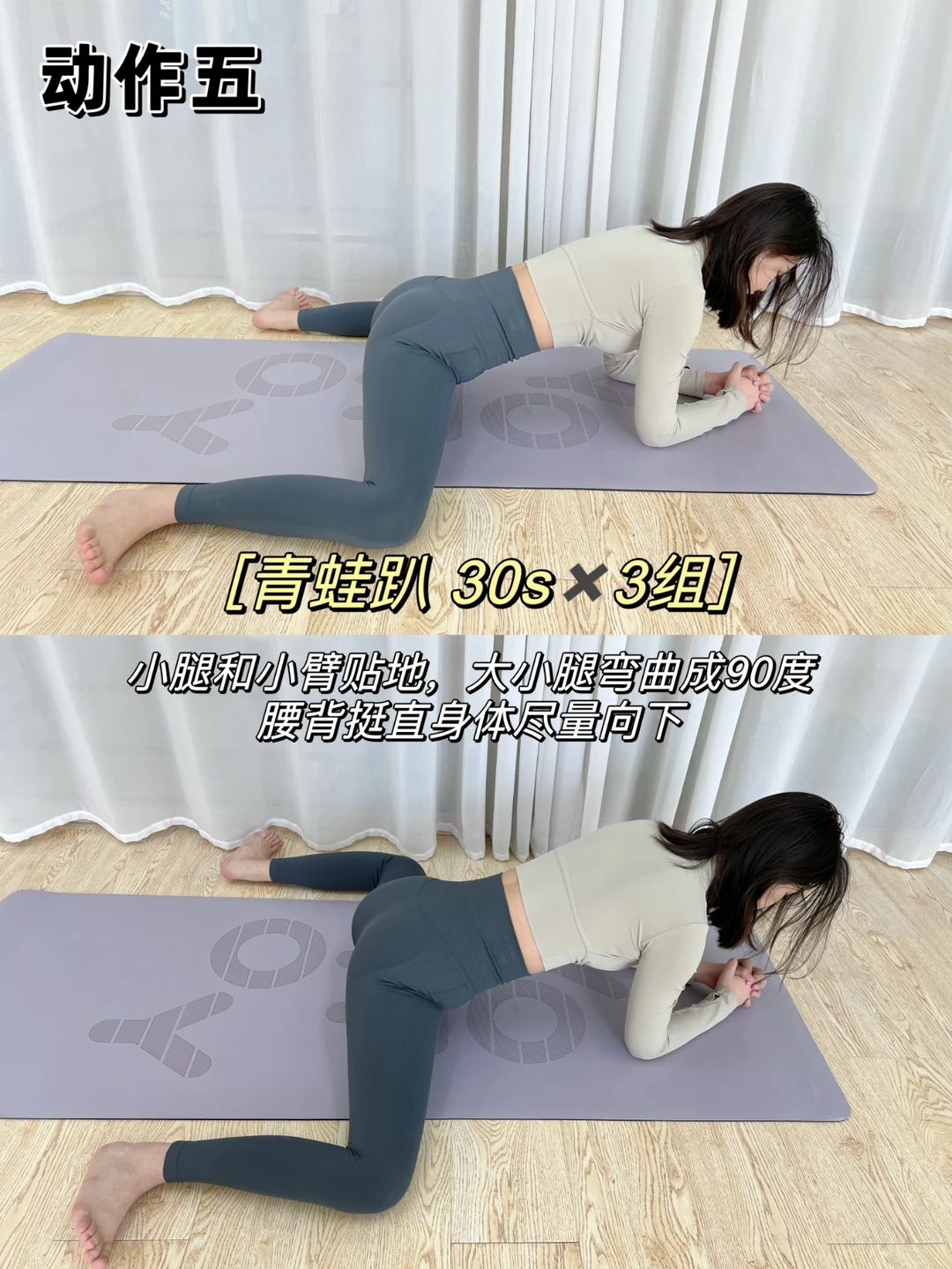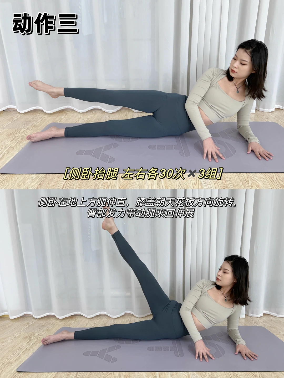 ✅动作二:侧卧蚌式开合;左右各20次*3组侧卧在地,双腿弯曲脚后跟并拢,上方腿向外打开到最大程度(髋部一直保持贴地)