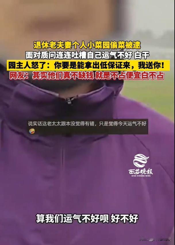 “看到别人家的菜园,手痒得很就要占便宜。”北京,一对条件不错的夫妻,拿着老人钱,生活富裕。但是路过农户的菜园,想着这便宜不占白不占啊,夫妻俩直接偷菜,给人家的菜地一顿嚯嚯。被主人家发现之后,又说自己“白干了”,又说自己“没钱赔”,看看这素质,真的让网友们叹为观止。 西安晚报12月8日报道了这则新闻。据报道称,这两位老人家都是北京生活比较富裕的人家,倒也不缺这点钱,但是就是缺这点素养。 12月7日,一对看似是已经离退休的老夫妻,大概六十多岁,想着溜达走去批发市场买菜。遛弯到一处郊野附近,看到农户家里的菜地里,种着绿油油的蔬菜,这可给夫妻俩乐的很。 当时二人互相对视了一眼,还真的挺心照不宣,俩人就大摇大摆的走进了农户的菜地。不说他们随地践踏蔬菜,看他们接下来的举动,就让人生气的很。 这俩人瞄准了菜地里比较肥美、长得比较高大的青菜,一把一把的扒拉,连根拔起之后,直接就堆放到自己随身携带的购物袋里。 夫妻俩分头行动,一个在这块田地里偷菜,一个就在另一个田埂里扒拉,不一会,二人的购物袋里就装的满满当当的。 而这一幕,疯狂偷菜的二人组,早就被农户主人家看在眼里,捉贼拿赃,主人直接就给这俩人抓个现行。 “喂!喂!你俩干嘛呢?跑我地里来偷菜?”主人家非常生气,看着眼前这俩人,一看就像是退休职工,穿着得体,面色精神,一定是富裕人家来的。 一开始,老太太还想着狡赖,说自己是贫困家庭,家里比较贫苦,想要来挖点菜回家吃吃。然而这一番说辞,可糊弄不了主人家。 “行啊,你说你是困难家庭,请提交一下你的困难证明,给我看一下,我立刻把这些菜都送给你。救助经济困难的人家,我也愿意!”主人家直接硬刚,但是老太太听了,显得非常尴尬。 无奈,老太太只能说实话:“我们夫妻俩是遛弯去前面的批发市场买菜的,路过这边看到你家菜长得不错,才想着拔两把。” 眼看被识破,老太太还说:“哎呀,算了算了,白干了,白白浪费体力,这菜都白拔了。”听到此言,主人家简直无语,偷人家菜没有得手,还显得自己很无辜。主人说:“要么你给我家的菜都重新种上哈!看你俩给我的菜地糟蹋的,一塌糊涂!” 大家看看这对夫妻俩,不仅没有意识到自己的错误,还反咬一口。主人家气不过,看他俩态度也不对,直接让对方赔钱。而老太太则说,“没带现金啊!”主人说,那就手机支付。老太太又说,“不会手机支付啊!” 说白了,就是一个字儿不肯赔。没带钱,你还说去农贸市场买菜?想想就觉得很无语。这么大年纪的人了,还满嘴谎言、闪烁其词。 大家说说看,是不是应该拨打个110,给这俩夫妻扭送到相关部门去不?然而,主人家也没特别计较,最后,俩夫妻把两袋子蔬菜丢下了,俩人就这样离开了菜地。 类似本案中的情况,夫妻俩随意跑到人家菜地里偷菜,这个行为是否违法呢?如果是退休人员,是否还有其他影响? 第一、偷点小菜可不是小事,法律后果很严重哦! 根据《治安管理处罚法》规定,随意到别人菜地偷菜,属于盗窃行为。如果蔬菜价值不高,一般会被处以5-10天行政拘留,并且处于500元以下罚款。如果情节严重,偷的多、多次偷,拘留时间更长、罚款也更高。 如果存在入户盗窃(偷菜),可能还会构成刑事犯法。这两位老夫妻,未经允许随意到人家菜地偷菜,此举已经构成违法,肯定要面临法律的严厉制裁。 第二、退休夫妻偷菜,可能会影响退休待遇。 《民典法》有所规定,离退休人员涉嫌偷菜,除了会面临治安处罚或者刑事责任,可能还会暂停发放养老金。后期释放之后,可能无法参与之后的养老金调整。 目前不确定这两位老夫妻是否是离退休人士,如果一经核实身份,这种丢人的操作不仅需要承担法律责任,还要面临退休金方面的限制,必定是有一定影响的。 不是自己的,可不要动坏心思哦,否则法律可不会放过你。对此,大家都怎么看呢?