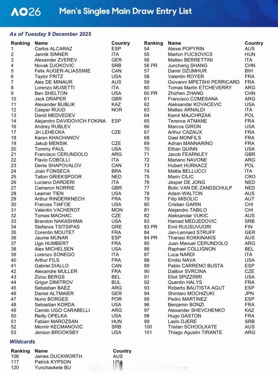 【2026澳网男女单打正赛签表】女单:郑钦文、王欣瑜、王雅繁、张帅入围。女单截止排名在103位。男单:张之臻、商竣程保护排名、布云朝克特外卡入围。