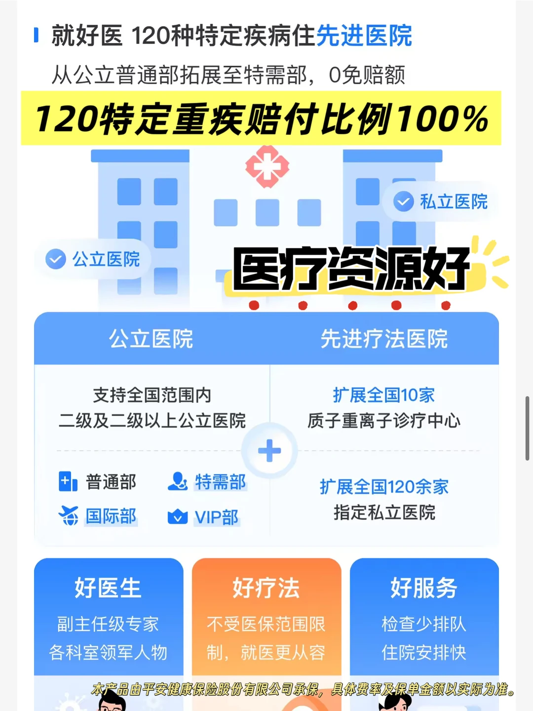 保障120特定种重疾,可选全国三甲特需部、指定私立医院赔付比例100%,还能对接专家团队,关键时刻享优质资源,不用在急诊室干等
