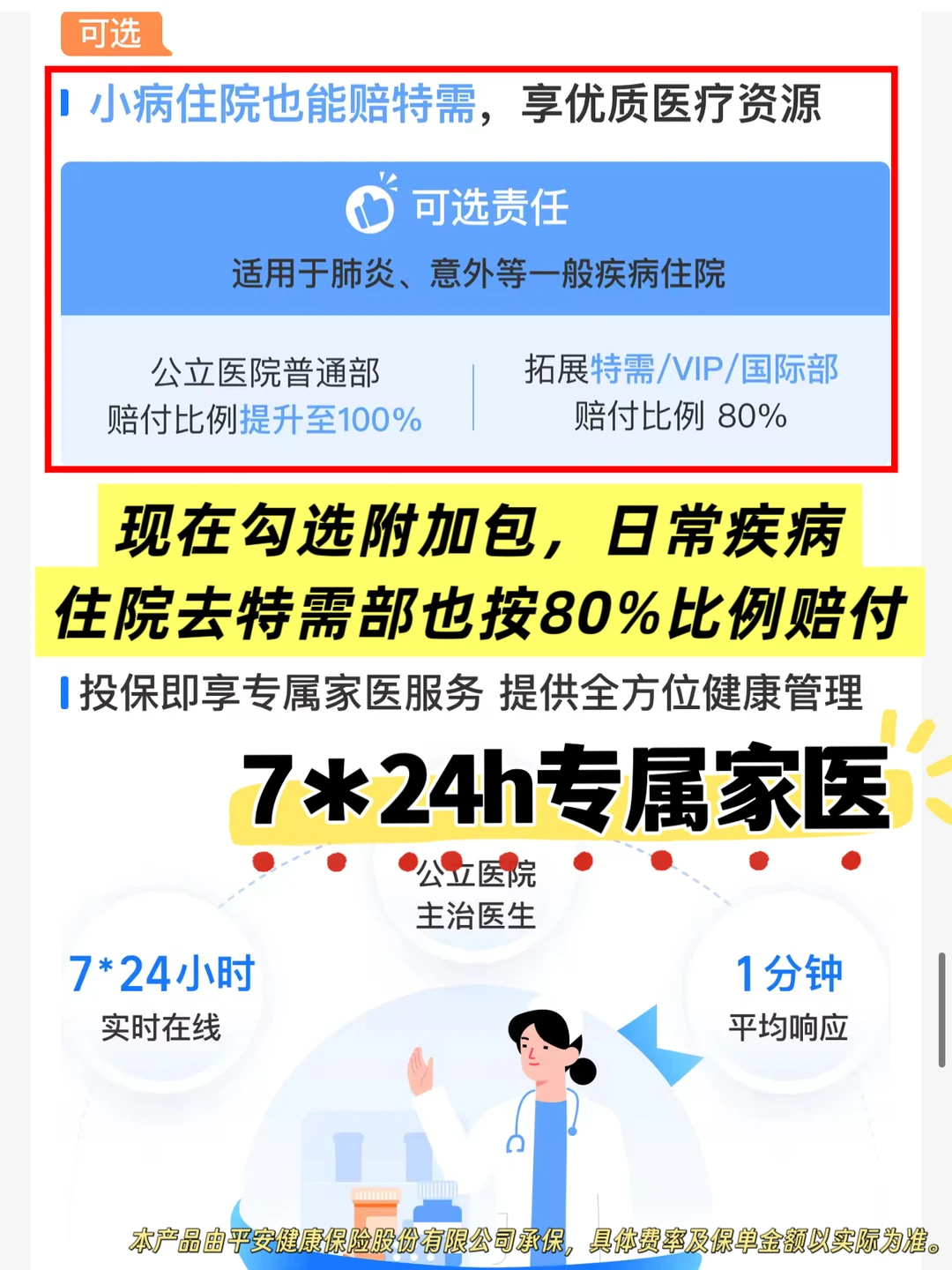 勾选拓展保障后,肺炎这种普通病也能去三甲特需部住院(赔付比例80%),公立医院普通部住院赔付比例100%