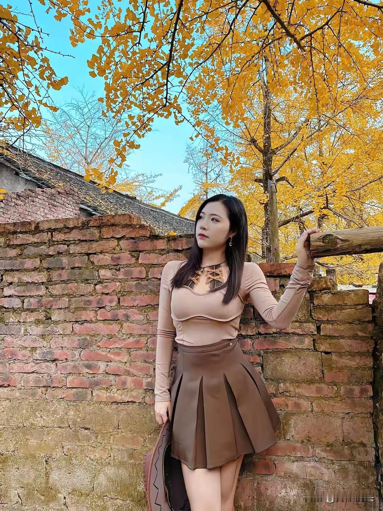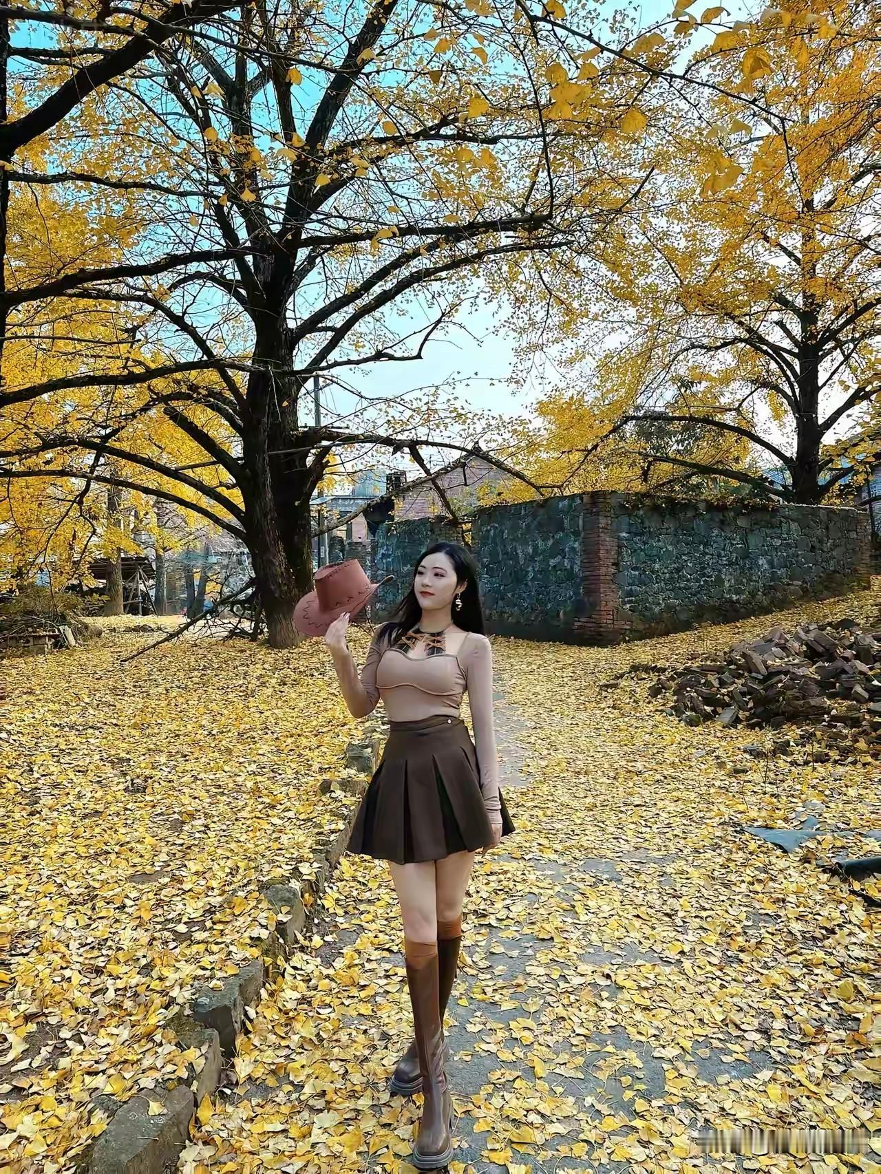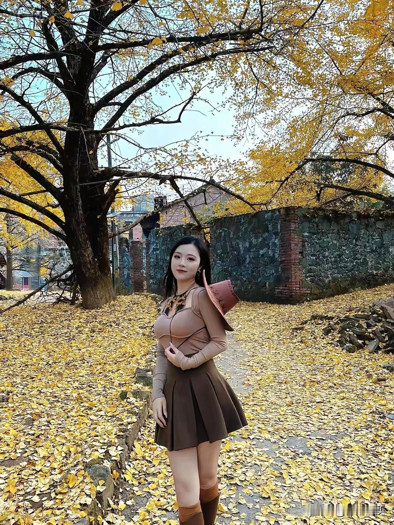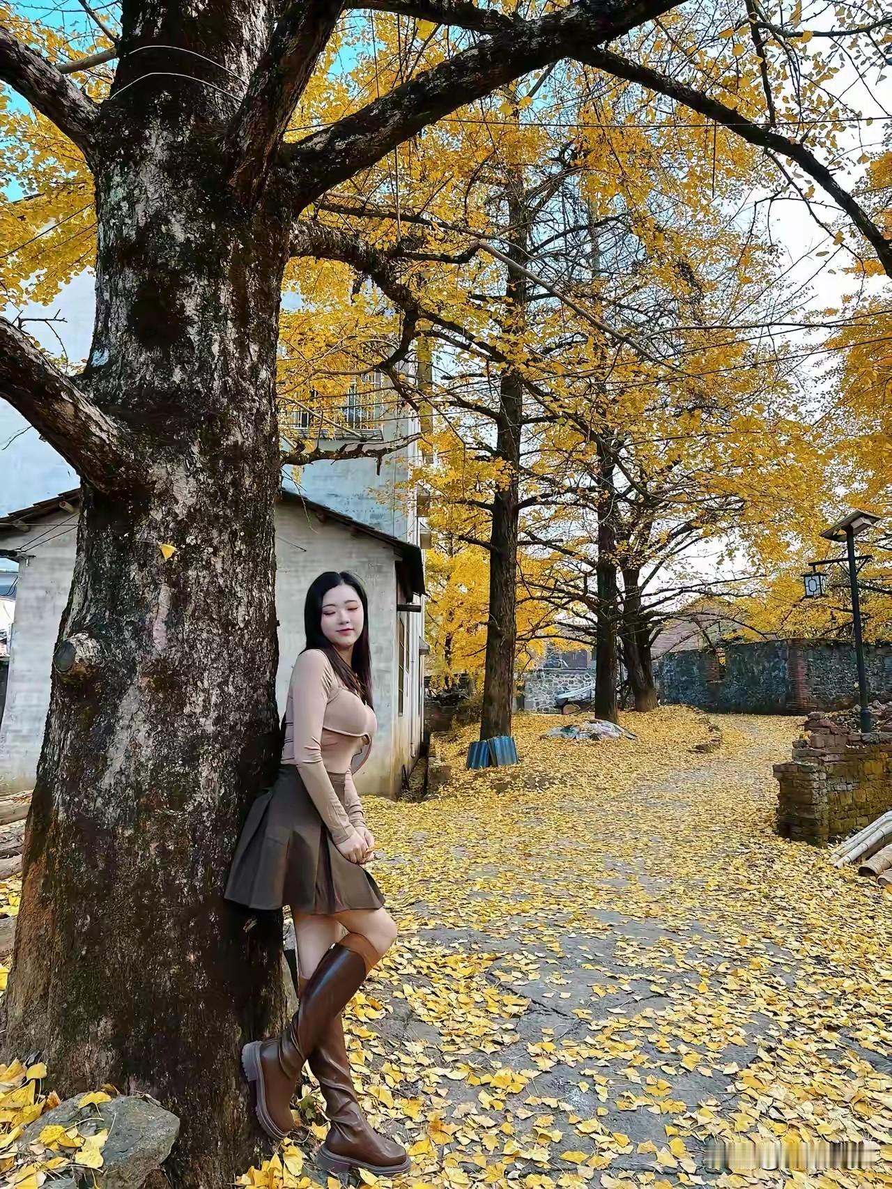 秋日暖阳下,黄叶铺满小径,少女倚树而立,静享时光。