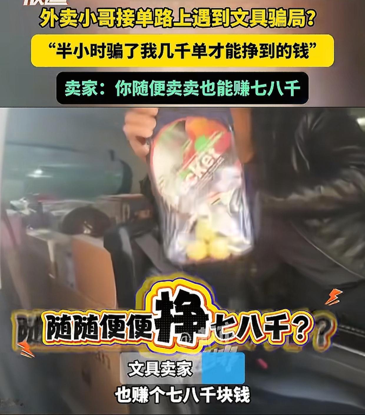 河南,外卖小哥杨先生接单路上,一名陌生男子忽然拦住他,神秘兮兮地说,自己有一大堆被学校退回的文具,才1.5元一件,问杨先生要不要。 杨先生一时好奇,就跟他去路边的商务车看了看,发现几个大纸箱里的文具品质都不错,远超1.5元一件的品质,有的看着甚至能值个10来块。 男子见杨先生有兴趣,在一旁趁热打铁说,这些东西你随便卖卖就能赚个七八千,年前你要是能卖完,我再给你搞一批,你闭着眼卖都能把过年的钱挣出来! 杨先生一听更是心动,觉得自己何其幸运,遇上这样好的赚钱机会,这岂不是比自己送卖外强多了! 想到这儿,杨先生没有犹豫,直接付了5200多元,把所有的文具都买了下来。 等到男子把箱子都搬下来,开着车子绝尘而去,杨先生才想起来检查一下货品,谁知仔细一看他傻眼了。 所有的箱子都只是在表面放着几件品质好的文具,可下面不是空壳圆珠笔,就是残次品的笔芯。 杨先生脑子嗡的一下,这才明白自己被骗了,他急忙给那名男子打电话,可再也打不通了,无奈之下他联系了记者。 见到记者,杨先生诉说了自己被骗的经历,希望更多的人引以为戒,接下来他表示,与其纠结被骗,不如爱心捐献。 最后经过记者帮忙联系,杨先生把自己买下来的所有能用的文具都捐给了一所聋哑学校。 看完视频,感觉杨先生确实太大意了,不但轻信了一个之前从没打过交道的陌生人,还在未加核实的情况下做出了购买决定。 试想一下,杨先生当时哪怕随便抽查一个箱子,也能戳穿骗局,不会让骗子得手了。 吃一堑长一智,相信杨先生能真正从此事中得到教训。 还有一点,杨先生被骗后还想着联系记者,用自己的经历警示他人,并且把文具送给有需要的人,这一点足以让人钦佩。
