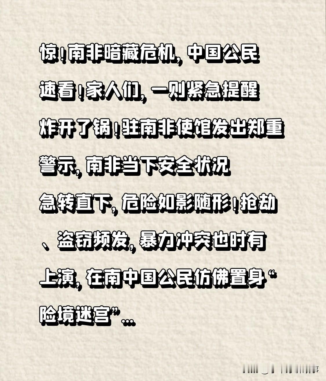 惊!南非暗藏危机,中国公民速看! 家人们,一则紧急提醒引发关注!驻南非使馆郑重警示,南非当前安全状况急剧恶化,危险无处不在! 抢劫、盗窃频发,暴力冲突也不时出现,在南中国公民仿若身处“危险迷宫”。使馆紧急呼吁大家,务必提高警惕!出行要结伴,勿让歹徒有可乘之机;谨慎保管财物,莫因疏忽引发大祸。 生命至上,平安无价!在南非的同胞们,定要将安全放首位,遇紧急情况别慌,及时报警并联系使馆。愿大家平安顺遂!