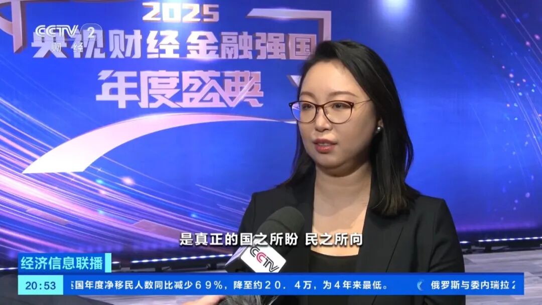 2025年12月8日,《2025年央视财经金融强国盛典》在中央人民广播电视总台财经频道重磅播出。本次盛典以“鸣改革强音筑金融强国”为主题,围绕金融“五篇大文章”发布“2025央视财经金融强国年度案例”,通过一个个扎根民生、服务实体的生动实践,解码中国金融的创新活力与责任担当。中国外贸信托总经理卫濛濛作为信托业代表,受邀参与纪录片拍摄,出席盛典并接受央视财经采访。