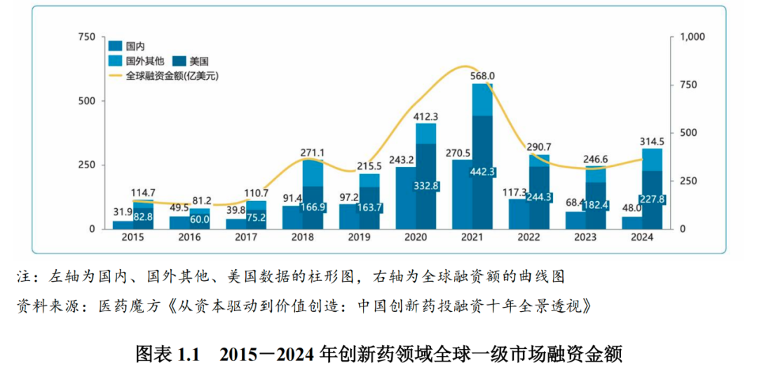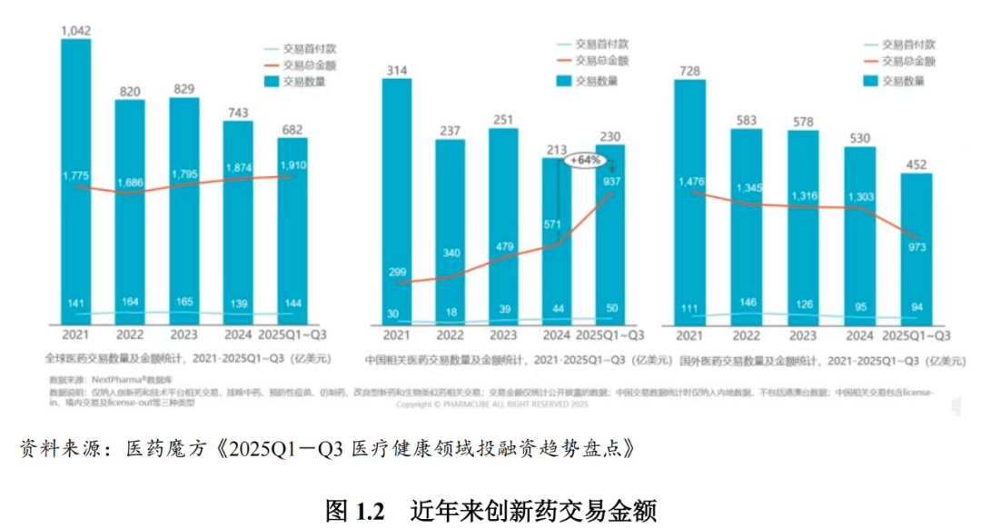近年来在政策驱动和市场需求的综合作用下,我国创新药企业快速发展,行业发展也从从早期fast-follow模式下的靶点“扎堆”与盲目内卷,行业发展回归理性,“热钱”也逐步从创新药中退出,全球创新药融资总额回落。2025年前三季度,跨国药企从中国License-in(引进授权)的交易总额占全球交易总额的近四成。