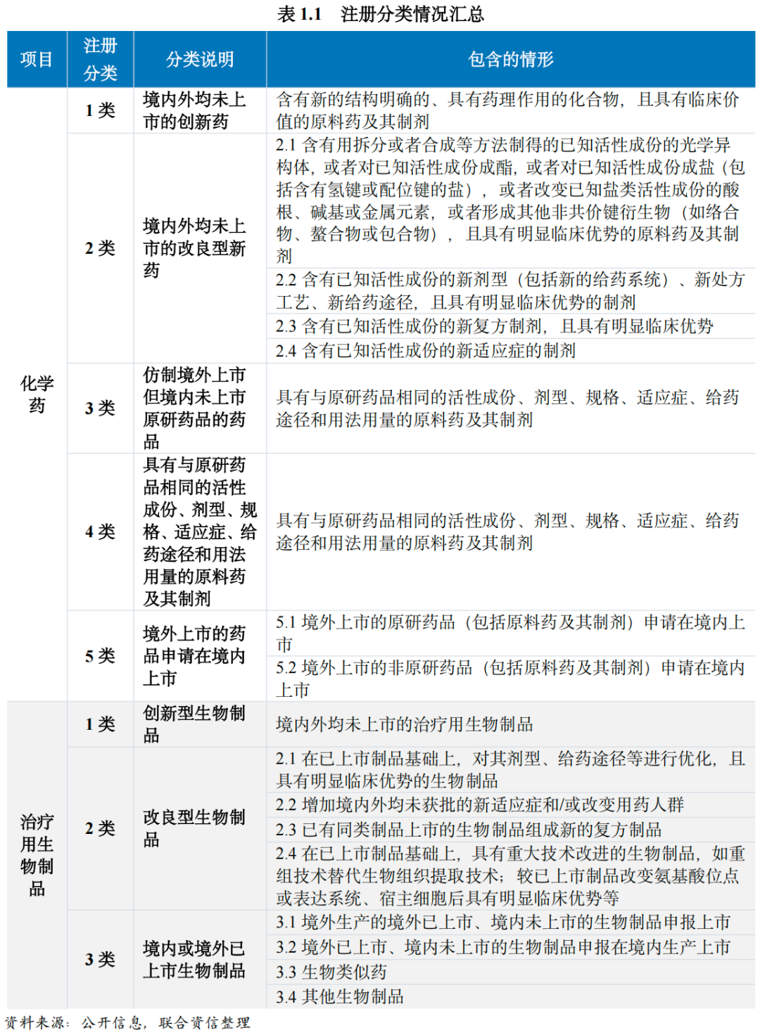 按照中国2007年出台的《药品注册管理办法》界定,新药是指未曾在中国境内上市销售的药品。2016年3月,国家药品监督管理局发布了《关于发布化学药品注册分类改革工作方案的公告》,将化药新药分为创新药和改良型新药,其中创新药是指含有新的结构明确的、具有药理作用的化合物,且具有临床价值的药品。2020年7月,国家药品监督管理局发布了《生物制品注册分类及申报资料要求》,将治疗用生物制品(生物药)分为创新型生物制品、改良型生物制品和境内或境外已上市生物制品。根据这两个文件以及当前国内创新药行业发展现状,可将1类、2类化学药和治疗用生物制品归为创新药。