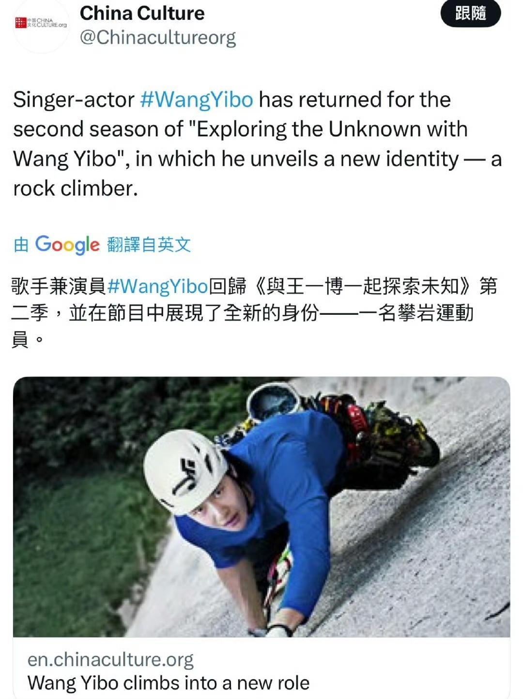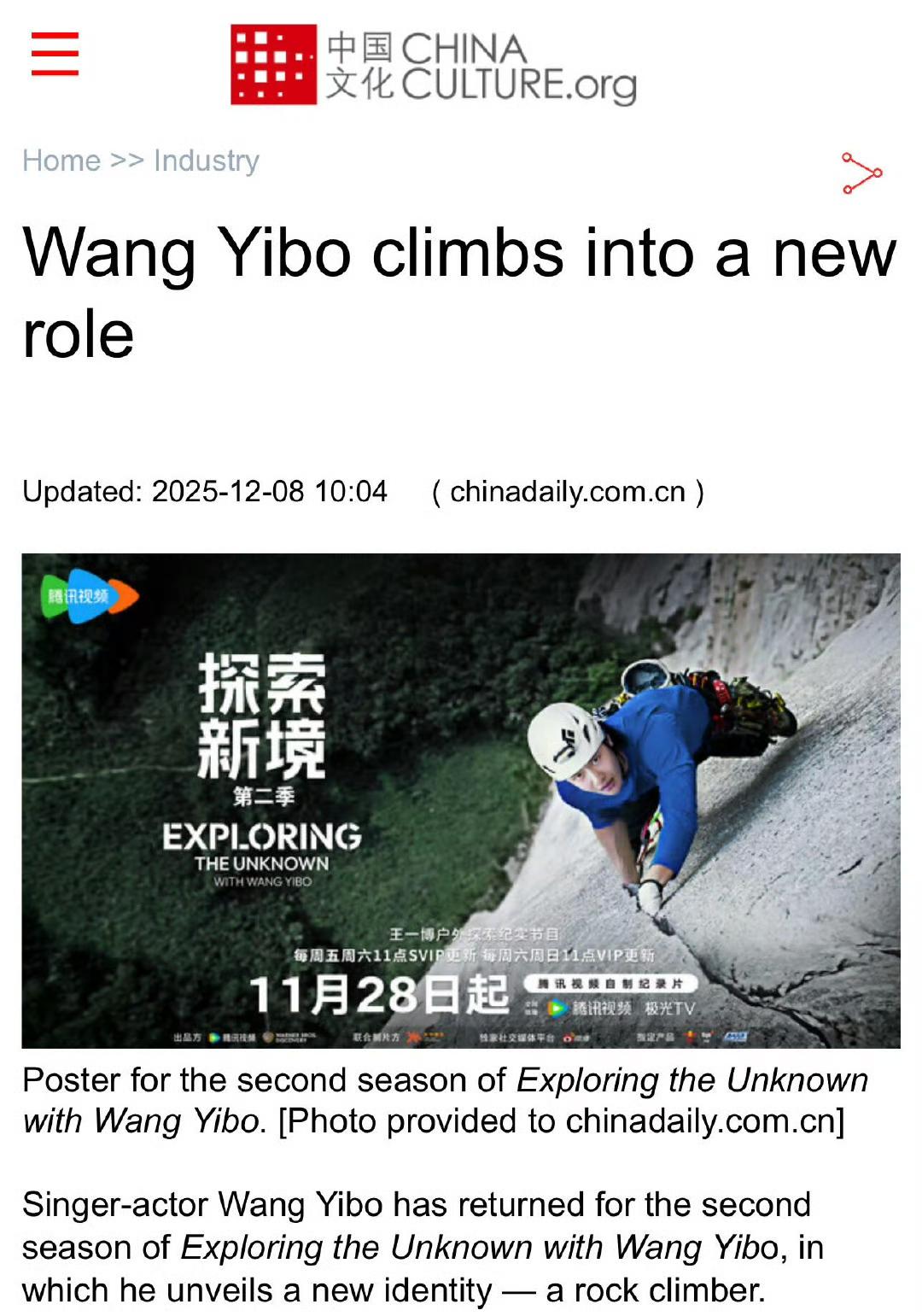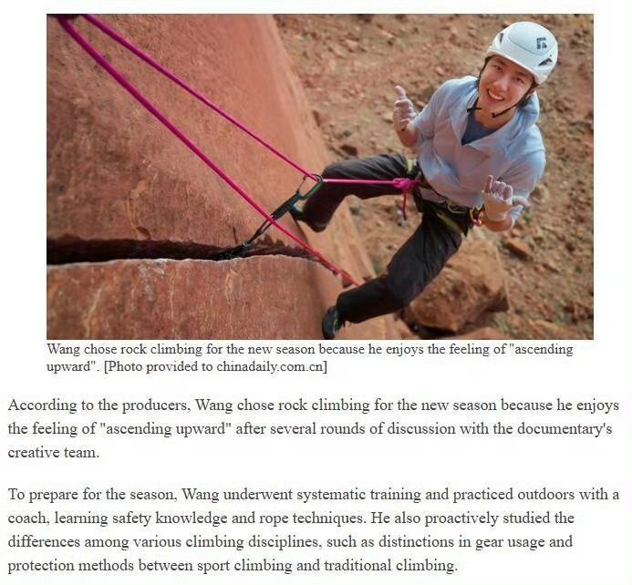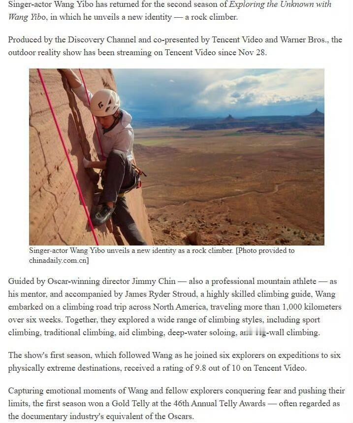 China Daily官网(中国日报外网)和China Culture报道了青年演员王一博的纪录片《探索新境》第二季——Wang Yibo climbs into a new role 报道称王一博在《探索新境》第二季中回归并解锁了新身份: “a rock climber(攀岩者)”[大金牙]。 “第一季凭借记录克服恐惧、突破自我的动人时刻,荣获第46届泰利奖金奖——该奖项常被视作纪录片界的奥斯卡。” 多重身份叠加,多领域跨界出彩,王一博的影响力就是已经公认的国内外全覆盖,主流正向宣传的不二人选。 王一博 王一博探索新境2
