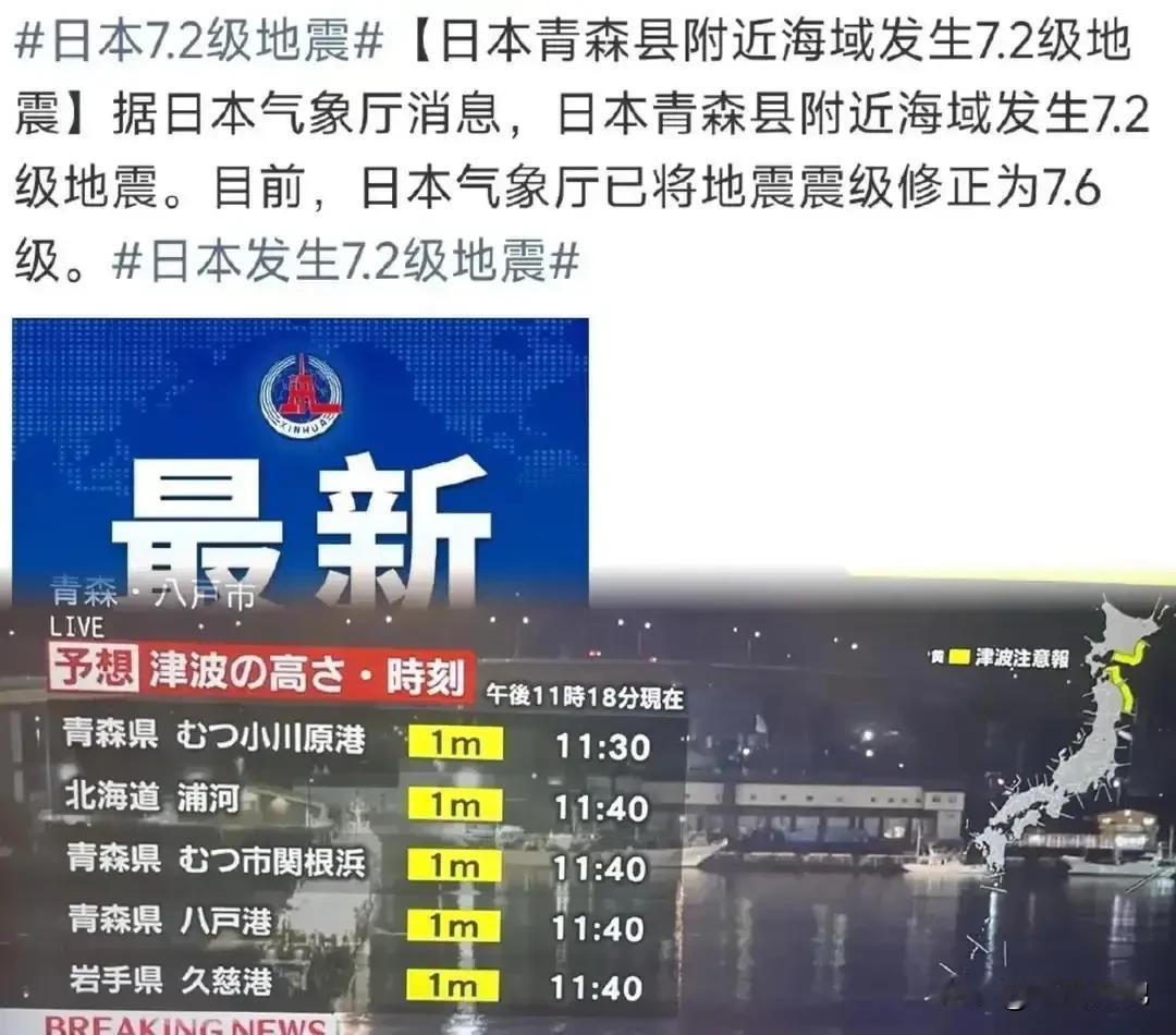 天狂必有雨,人狂必有祸!高市叫嚣“台湾有事,就是日本有事”,时隔一个月,台湾没事,日本却有有事,是地震天灾给予搞事的惩罚! 根据NHK的报道,昨日(12月8日)日本青森县东部海域发生 7.6 级地震,今日(12月9日) 5 时 52 分本州东部远海再发 6.6 级余震,青森县八户市观测到震度 6 级的强烈震动。把自己一份三分地守好就好。 小编并非幸灾乐祸,确实为日本受震灾的人员伤亡和财产损失,也表示深感同情 ,但日本高市作为现任日本首相,不认真反省日本军国主义侵华历史罪行,反而置国际法理事实所不顾,对一个主权国家内台湾肆无忌惮挑衅。 这真是苍天曾经饶过谁,不能不说大自然在惩罚不知天高地厚的好战分子,日本唯有摈弃右翼军国主义野心,老老实实给中国人民真诚道歉,这才是日本应有的国家担当的样子!