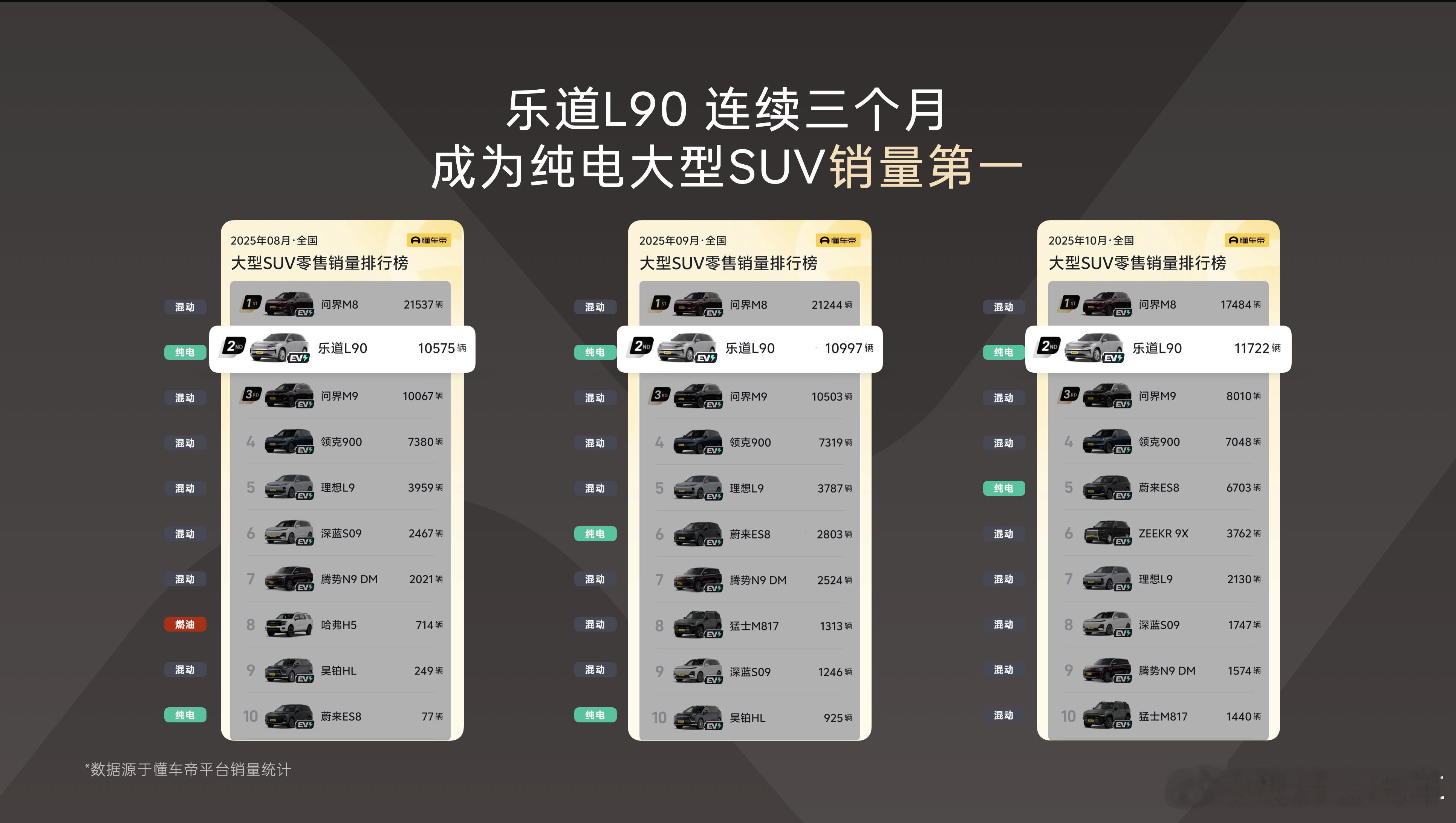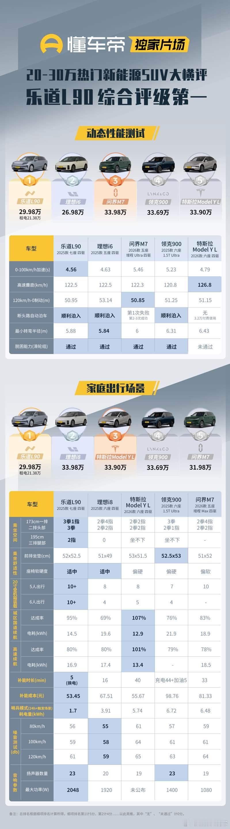 乐道L90好车确实不怕实测,卖的好是有原因的。看看懂车帝的这次测试结果:乐道L90虽然是一款家庭大三排SUV,但在极限动态性能的超纲测试中,动力性、操控性、灵活性甚至比五座中大型SUV更好,零百加速甚至只有4.56s、排名第一,泊车辅助优于所有车型!在家庭用户最关心的空间、续航补能等维度上,同样做到了全场领先水平。一二三排的乘坐空间、4-7人出行的储物空间,均位居第一!在续航补能上,不仅补能速度最快、成本最低,而且国道、高速多工况下的续航达成率、电耗都处于领先水平。哨兵模式耗电量更是全场最低,仅1.7kWh/天,排名第二的理想i8耗电量是L90的2倍,耗电量最高的领克900甚至是L90的4倍左右!乐道L90之所以能交出这份“全优成绩单”,背后是源自蔚来的十年纯电技术积累、三代平台迭代带来的断代领先优势。值得一提的是,在懂车帝两次大横评中,综合排名靠前的都是纯电车型。市场表现同样印证了“纯电的领先性越来越强”,新势力中的纯电与增程占比,由去年“五五开”,加速向“八二开”迈进。乐道L90