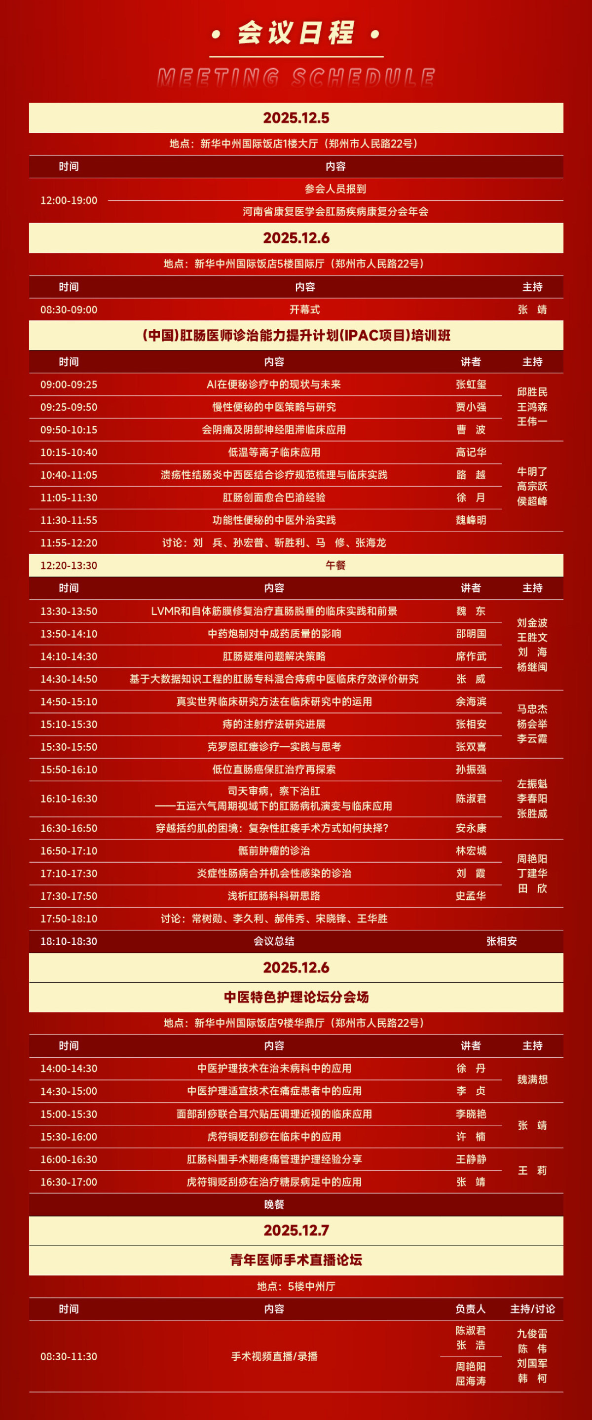 会议内容丰富多样。涵盖肛肠学科国内外新研究进展、诊治策略及疑难点、典型病例交流,让参会者了解前沿动态,从实际案例中汲取经验;聚焦中医药防治肛肠疾病的新进展,探索中医药在该领域的创新应用;注重肛肠医师临床诊治能力提升,助力医师成长;开展名老中药专家学术经验传承和发扬活动,让宝贵经验得以延续;设置青年医师手术直播环节,为青年医师提供展示和学习的平台;举办中医传统特色疗法护理论坛,探讨护理新方法。
