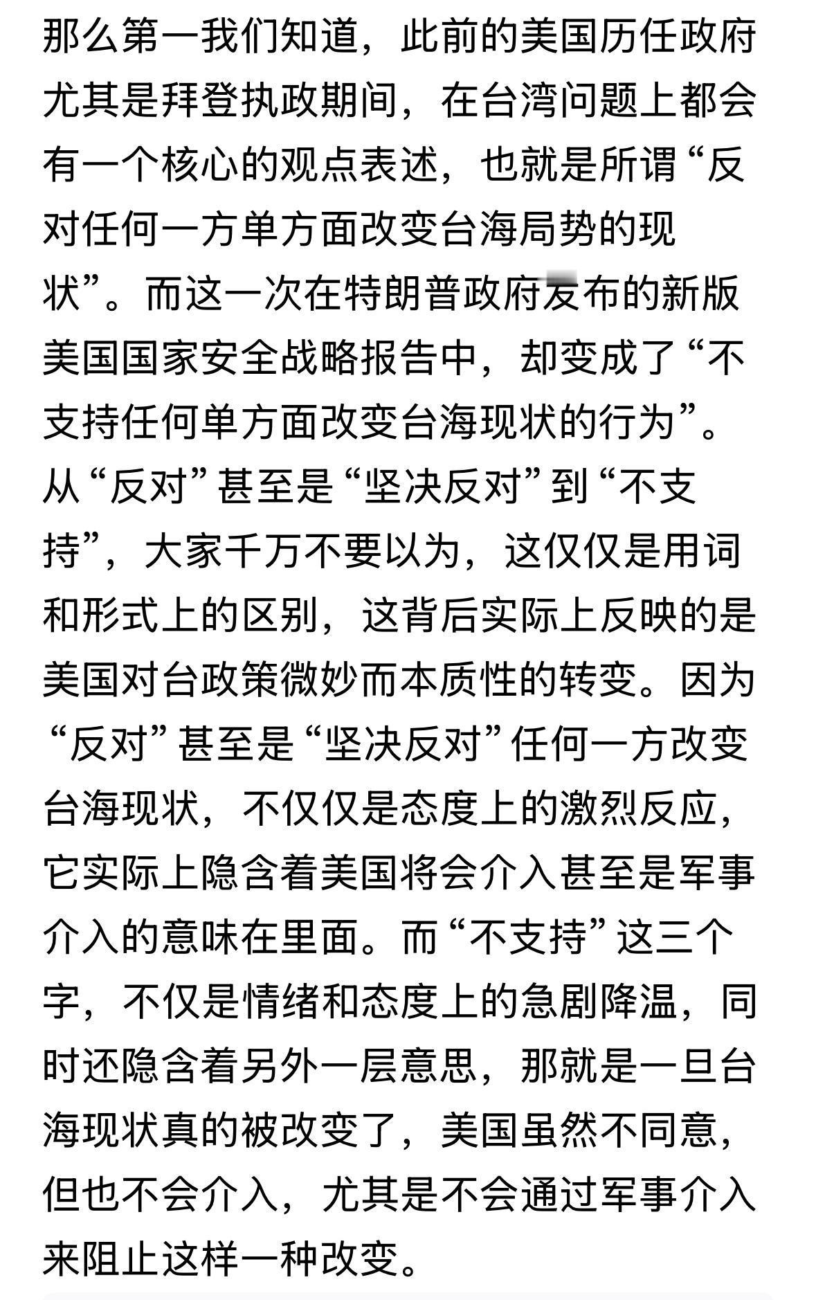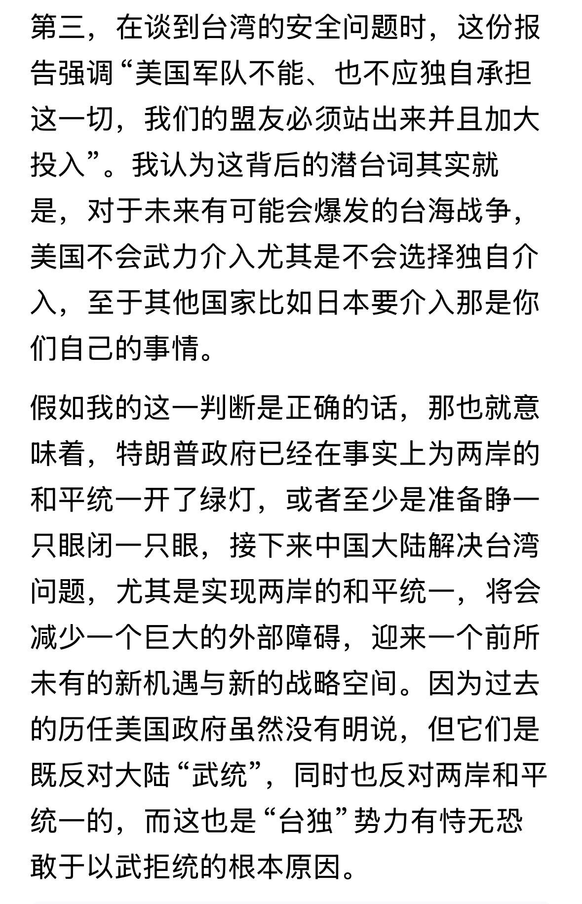 刘和平根据特朗普对新国安战略分析,美国发出“不反对两岸和统”的信号?美国从来没有说过反对中国和平统一,其他国家也没有敢说反对和平统一的,他们都是以反对动用武力的名义干涉中国内政。刘和平认为,美国新国安战略明显多次提到台湾问题,但是释放出不会干涉台湾事务的信号,这个逻辑,显然是说不通的。事实上,特朗普最近签署的台湾保证实施法案,以及对台3.3亿美元的军售计划,都是对中国内政的严重干涉。#美国新国家安全战略##台湾保证实施法案#