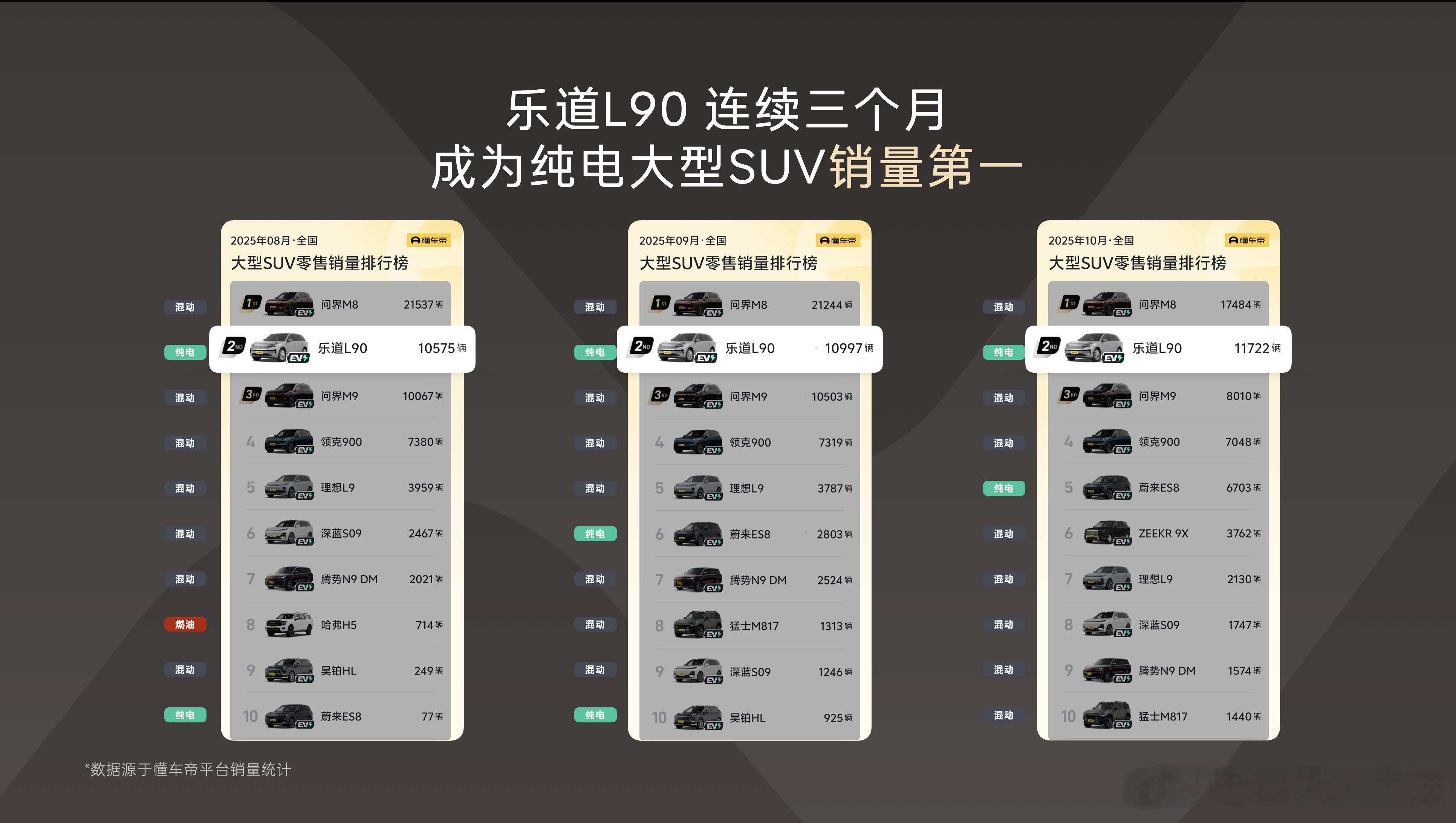 在之前懂车帝“绝不充值”的史上最全6座SUV十车对决中,乐道L90六座版综合评级第一!我们看到这次原班人马打造的“热门新能源SUV大横评”,乐道L90七座版以“5+2”灵活布局对同场的大五座、大三排车型中再次夺冠!乐道L90虽然是一款家庭大三排SUV,但在极限动态性能的超纲测试中,动力性、操控性、灵活性甚至比五座中大型SUV更好,零百加速甚至只有4.56s、排名第一,泊车辅助优于所有车型!在家庭用户最关心的空间、续航补能等维度上,同样做到了全场领先水平。一二三排的乘坐空间、4-7人出行的储物空间,均位居第一!在续航补能上,不仅补能速度最快、成本最低,而且国道、高速多工况下的续航达成率、电耗都处于领先水平。哨兵模式耗电量更是全场最低,仅1.7kWh/天,排名第二的理想i8耗电量是L90的2倍,耗电量最高的领克900甚至是L90的4倍左右!乐道L90之所以能交出这份“全优成绩单”,背后是源自蔚来的十年纯电技术积累、三代平台迭代带来的断代领先优势。值得一提的是,在懂车帝两次大横评中,综合排名靠前的都是纯电车型。市场表现同样印证了“纯电的领先性越来越强”,新势力中的纯电与增程占比,由去年“五五开”,加速向“八二开”迈进。乐道L90