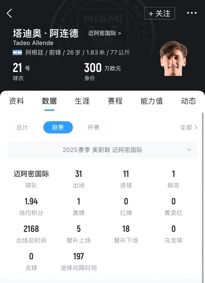 阿连德本赛季代表迈阿密国际6场季后赛中打入9球,决赛中接梅西助攻打入锁定胜局的一球,帮助球队拿到本赛季美职联总冠军。