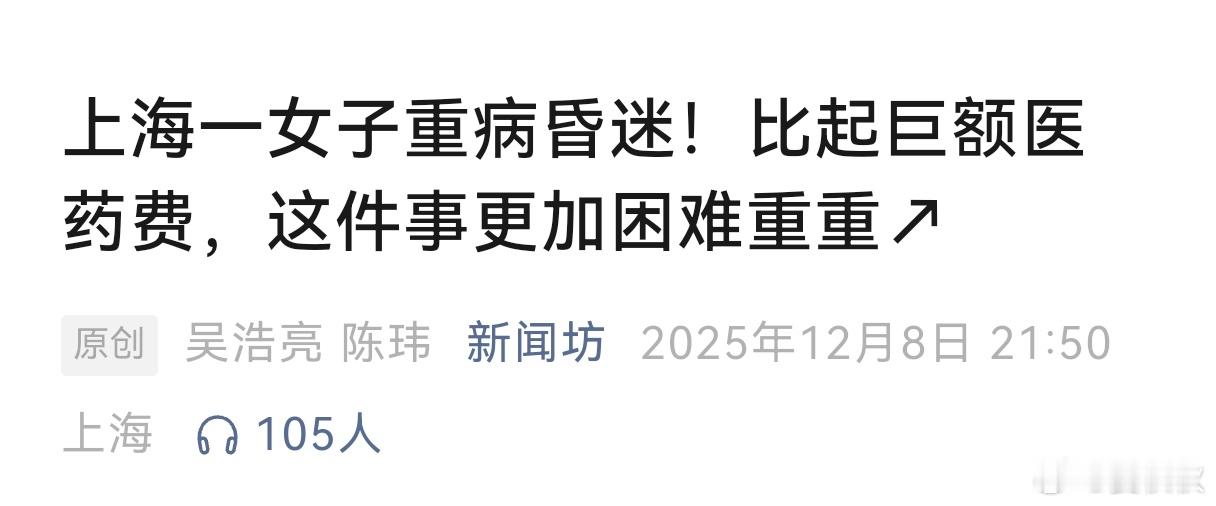 蒋女士依旧在等待你还记得上海那个46岁的蒋女士吗?就是那个无亲无故,突发脑出血被同事送医的蒋女士。因为昏迷在ICU,蒋女士存款拿不了,保险赔不到,靠远房表亲和同事垫付医药费,经历了第一场手术。此后,她只能悬滞在制度的缝隙里,依靠着陌生人的善意和一套缓慢启动的法律程序,来争取活下去的可能。坊间震惊。老龄化社会,每一个人,都有可能成为蒋女士。如今,“新闻坊”为我们带来了蒋女士的最新进展。目前,蒋女士已脱离呼吸机,恢复了部分意识,但仍处于浅昏迷状态。为了处理脑出血引发的脑积水,最新一场手术,医院接受由居委会签字。未来,如果身体符合条件,会争取再做一个手术。蒋女士在兰州的远亲,也就是她的姑姑的亲属,最终婉拒担任其监护人。目前,蒋女士所在的邮电新村居委会,实际承担起“临时监护人”的职责。老实说,蒋女士遇到了一个很不错的医院,也遇到了一个很好的居委会。在过去这段时间,经过居委会多方沟通与协调,蒋女士所购买的重疾险理赔程序,取得了关键突破,一家保险公司“特事特办”,75000元的理赔金,进入了住院账户。但是,她的医疗费实际已超过20万元。法院监护指定要六个月,居委现在只是“临时监护人”。而这个临时身份,并不具备法律效力,很多地方,都不认居委的签字……所以呢,昏迷的蒋女士,依旧在等待。据我了解,如果她不是46岁,而是超过了60岁,那么就还有一些操作办法……蒋女士的遭遇,是一面镜子。她提醒我们,对“晚年困境”,千万不要刻意回避或盲目乐观。社会系统或者你的亲情网络,不一定接得住一切。最好的方法,还是在清醒的时候,未雨绸缪,提前指定值得托付的人,也就是我们常常说的“意定监护”。上海市今日热点上海晏秋秋