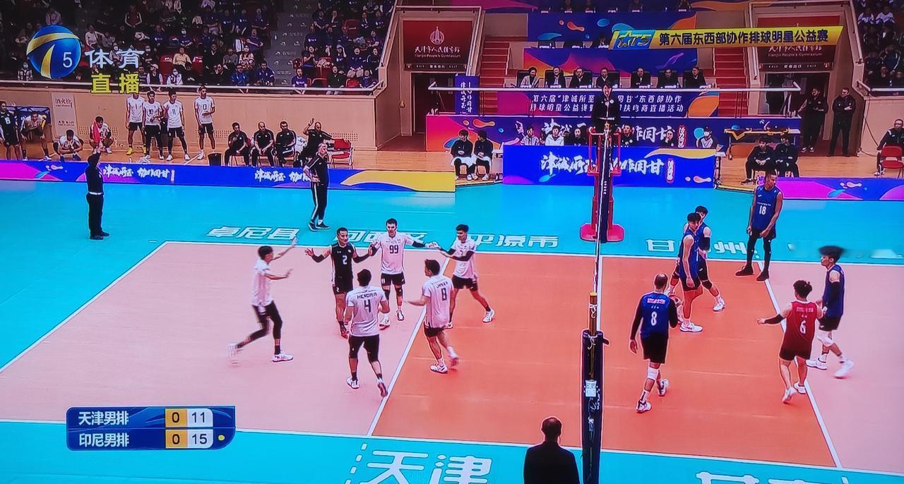天津电视机体育频道正在直播东西部公益赛比赛!而且还有专业解说孟繁达和天津女排的王宁特别解说。 虽然只是一场热身赛,但是对比铁人杯三强对抗赛没有直播信号,天津电视台的直播还是挺给力! 嘉宾看台上,天津市体育局的领导也在现场观看比赛。还有一些天津女排的球迷们在现场观看比赛。 以前的东西部公益赛都是天津女排的比赛,今年天津女排本周五就要开始排超联赛,又刚刚结束铁人杯三强对抗赛,天津女排今年没有时间参加公益赛了。今天由天津男排对阵印尼男排进行比赛。 天津男排热身赛上的比赛阵容,应该就是排超联赛的主力阵容。天津男排外援拉玛尔和阿力,副攻陈龙海,二传陈展豪,自由人广东引进的内援。副攻王昌利。 感觉天津男排的新阵容磨合默契度还是不够,开局天津男排比分落后。局末阶段天津男排追近比分只差一分。关键分时刻印尼男排把握机会,印尼男排以25-21拿下第一局比赛。