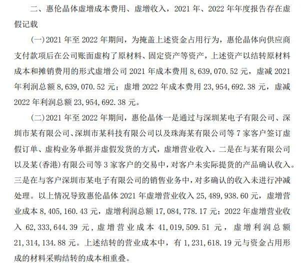 二是,惠伦晶体2021年、2022年虚增成本费用、虚增收入。