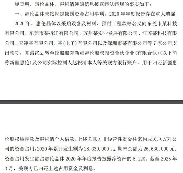一是,惠伦晶体未按规定披露资金占用事项。据介绍,2020年,惠伦晶体以采购设备及材料、预付工程款等名义分别向东莞市某科技有限公司、东莞市某拆迁有限公司等7家公司支出款项,并最终划转至控股股东新疆惠伦股权投资合伙企业(有限合伙)(以下简称新疆惠伦)及公司实际控制人赵积清本人等关联方银行账户,用于归还新疆惠伦股权质押款及赵积清个人借款。