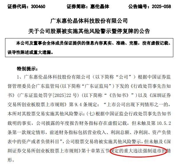 惠伦晶体在另一份公告中表示,上述违规未触及《深圳证券交易所创业板股票上市规则》第十章第五节规定的重大违法强制退市的情形。同时被实施其他风险警示,股票简称由“惠伦晶体”变更为“ST惠伦”;股票代码不变,仍为“300460”。