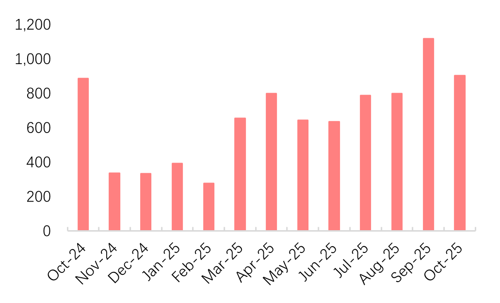 从ABS发行规模来看,截至2025年10月末,以发行起始日统计,消费金融行业共发行ABS(包括资产支持票据ABN,下同)的规模7017.3亿元,较去年同期增长14.8%。2025年10月内,消费金融行业ABS发行规模为904.6亿元,其中信贷ABS规模为335.6亿元、企业ABS规模为307.4亿元、ABN规模为261.7亿元,分别占比37.1%、34.0%、28.9%。