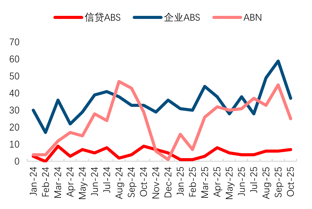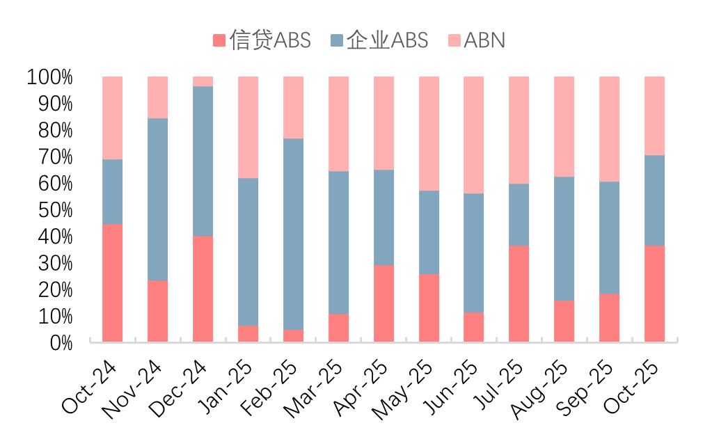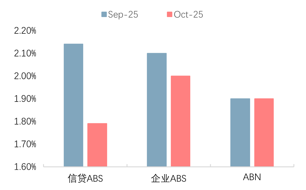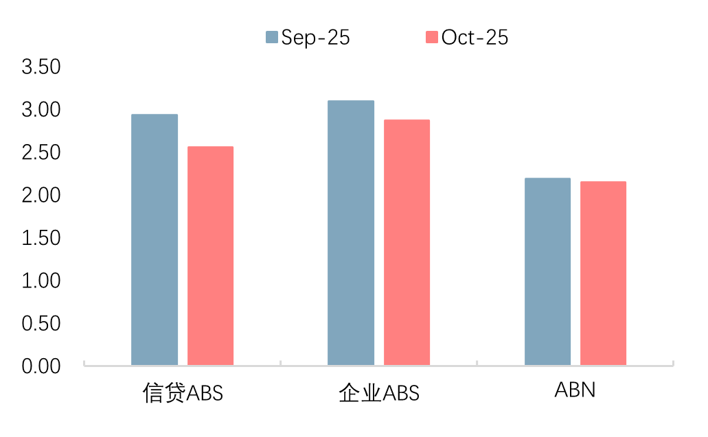 从发行期限和发行利率来看,起息日始于2025年10月的消费金融行业新发信贷ABS的平均期限为2.56年,环比下降;票面利率中位数为1.79%,环比下降35bps。新发企业ABS的平均期限为2.87年,环比下降,票面利率中位数为2.00%,环比下降,与8月持平。新发ABN的平均期限为2.15年,环比小幅降低,票面利率中位数为1.90%,环比持平。