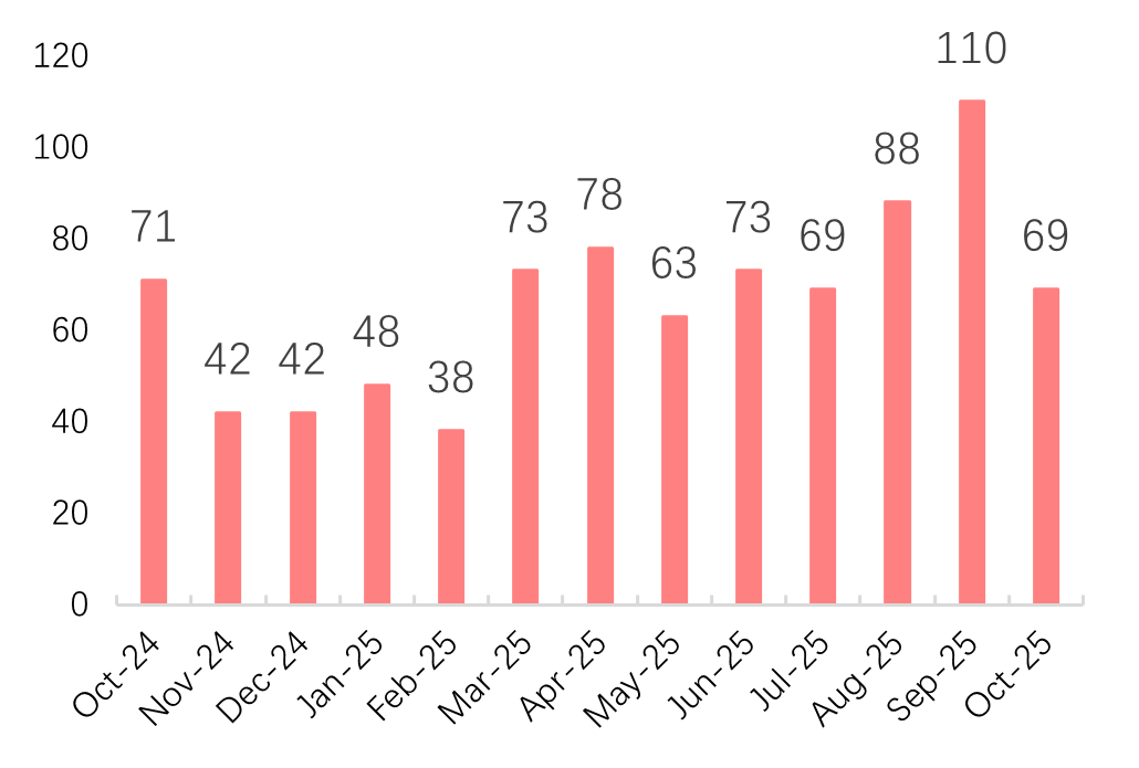 从发行数量来看,截至2025年10月末,以发行起始日统计,消费金融行业共发行了709只ABS,较去年同期增长20.0%。2025年10月内,消费金融行业ABS发行数量为69只,其中信贷ABS数量为7只、企业ABS数量为37只、ABN数量为25只,分别占比10.1%、53.6%、36.2%。