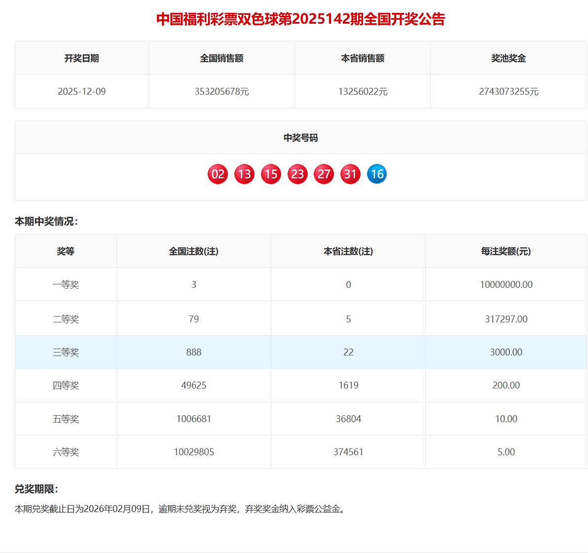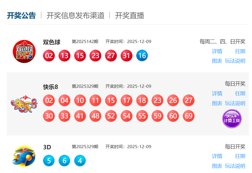 大皖新闻讯12月9日晚,安徽福彩网更新了彩票开奖公告。其中,双色球开出3注一等奖,单注奖金1000万元。具体如下: