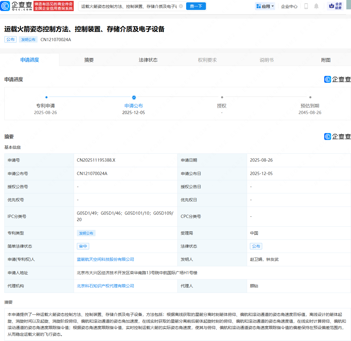 企查查APP显示,近日,蓝箭航天空间科技股份有限公司申请公布“运载火箭姿态控制方法、控制装置、存储介质及电子设备”专利。