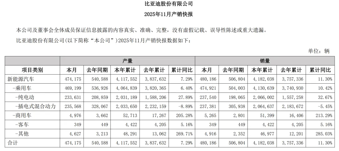 12月5日,比亚迪在深圳坪山总部举行临时股东大会,王传福在会上首次回应比亚迪销量下滑,在他看来:一方面由于比亚迪当前技术领先度不及前几年,技术成果的市场惊艳度有所下降,叠加行业同质化特征渐显,这一变化符合产品及技术发展的周期性规律;另一方面,低温充电速度慢等用户需求痛点,也亟待通过技术突破予以解决。满谈汽车王传福介绍,比亚迪对于未来发展明确了几大方向:一是未来2至3年将全面攻坚电动化技术及智能化下半场,加大技术研发与投放力度,推出更具领先性的技术成果,继续扩大技术领先优势;二是未来将同步强化营销等配套能力,精准对接用户需求,实现技术优势向市场竞争力的高效转化;三是持续加大力度开拓海外市场。王传福坦言,过去市场顺风期,比亚迪在营销上存在“惰性”,后续将加快调整步伐,加强品牌力建设。比亚迪将在高端品牌方面推出更具竞争力的技术和产品,进一步强化技术领先地位,推动公司持续发展。比亚迪不会打“营销战”,作为行业龙头,公司坚持不拉踩对手,虽然短期可能损失市场份额,但能赢得长期口碑,以及行业及消费者的认可。未来,比亚迪计划通过举办更多的线下体验活动,让消费者亲身感受产品的优势;加强与社交媒体的合作,提高品牌的曝光度;优化售后服务体系,提升客户满意度等方式,来提升品牌形象和市场影响力。长久以来,比亚迪凭借着技术创新和多元化的产品布局,在销量上一路高歌猛进,成为行业内的领军企业,但自下半年开始,比亚迪开始遭遇销量下滑。据比亚迪公布的数据显示,2025年11月比亚迪新能源汽车销量为48.0万辆,同比下滑5.3%,其中新能源乘用车销量为47.5万辆,同比下滑5.8%。截至11月底,比亚迪新能源汽车累计销量418.2万辆,同比增长11.3%,其中新能源乘用车销量为413.1万辆,同比增长10.4%。不过,据统计,如果剔除海外销量,比亚迪单月销量已经连续7个月同比下滑,前11月销量则同比下滑4.8%。虽然国内市场面临挑战,海外市场又成为比亚迪新增长点。2025年前11个月,比亚迪乘用车海外销量91.29万辆,同比增长153.58%,这一数据已远超2024年全年海外销量总和,海外市场占比持续提升。