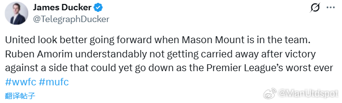 今天曼联跟队记者TA LW和电讯报JD 都发文表扬芒特在本赛季表现提升,并且很适合阿莫林的体系。ManUtdspot狼队1比4曼联曼联
