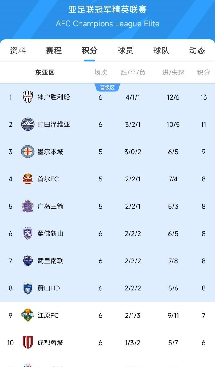 两场平局、依旧倒数 亚冠精英联赛东亚区第六轮今晚开战,中超冠军上海海港以及成都蓉城先后出战,两队在客场分别战平神户胜利船和柔佛新山! 率先出战的成都蓉城客场面对积分排名第一的神户胜利船,在先丢一球的情况下连扳两球以2-1反超,补时阶段李扬送点,蓉城最终在客场与神户胜利船2-2握手言和,亚冠四轮不胜,依旧排在东亚区第十,距离第八的蔚山有两分差距! 随后出场的中超冠军上海海港远征马来西亚迎战柔佛新山,整场比赛海港被全面压制,无论是控球率、角球、射门次数都全面落后,尤其是射门次数,柔佛新山狂轰48脚,其中12次射正、有4次得分机会,如若不是海港门将陈威高接低挡,中超冠军这一次客场之旅恐怕要遭遇惨败,赛后海港门将陈威收获了10分的满分评分! 不过上海海港亚冠六轮不胜,仅拿到两分排名东亚区倒数第一,不出意外的话,海港应该是无缘淘汰赛了!