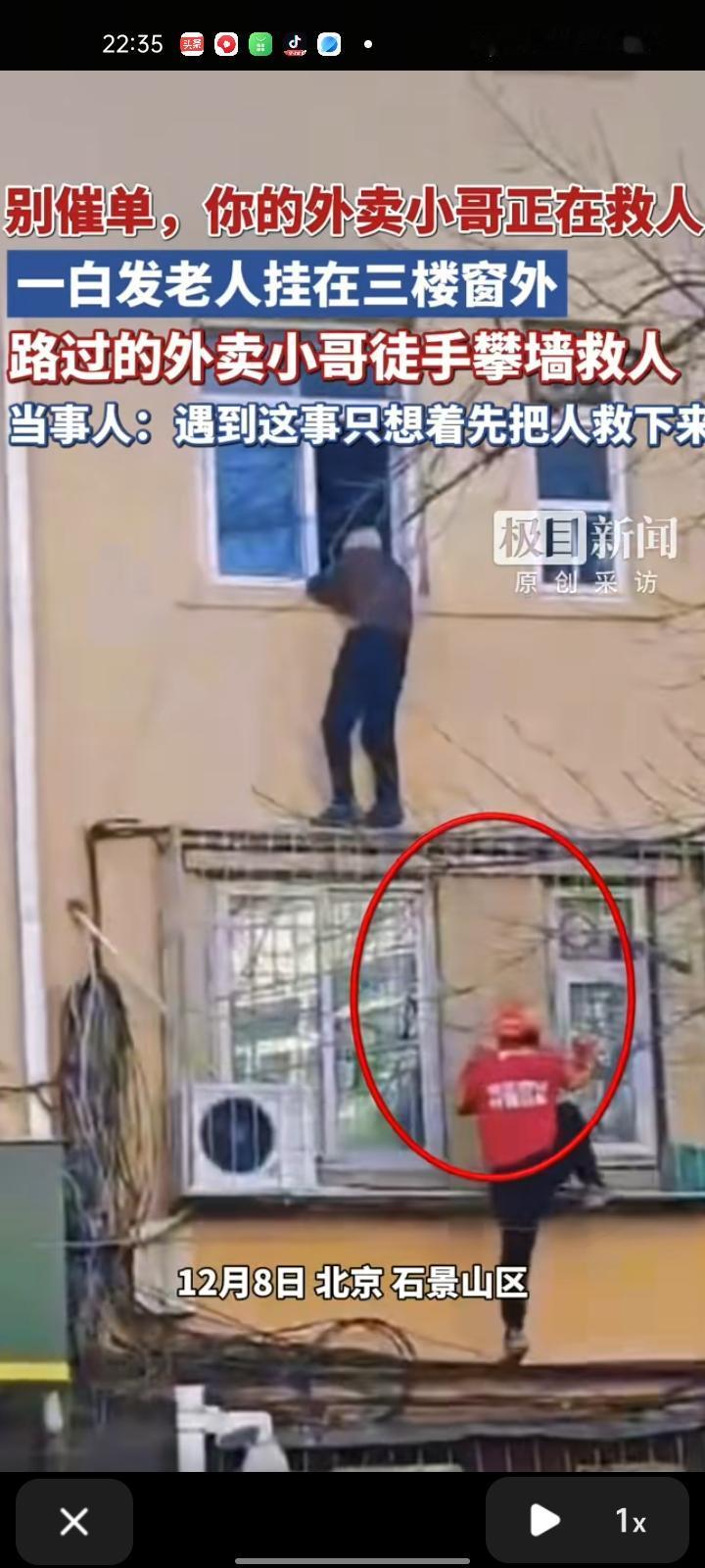 12月8日,北京。一白发老人被挂在三楼窗外,路过的外卖小哥见状徒手爬墙救人。外卖
