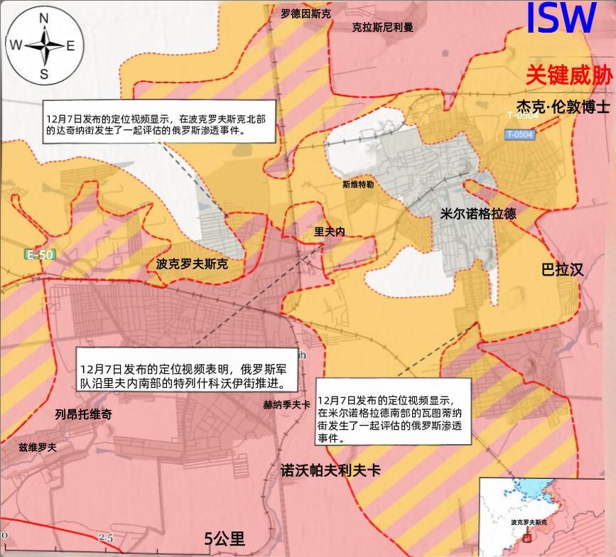 红军城战况更新:避免被围,乌军撤出米城南部地区 12 月 7 日至 8 日期间,俄军在波克罗夫斯克周边及城区发起全域性攻击:西北方向直指赫里希内,北部聚焦罗丁斯克 和 比列托茨克,东北部覆盖克拉斯尼利曼 、费多里夫卡F、斯维特尔及新经济区 等区域,东部逼近米诺拉德,西南部则针对科特林、乌达赫讷、兹维罗夫和莫洛德斯克展开攻势 。 12 月 7 日公开的地理定位视频显示,俄军在波克罗夫斯克以北的罗丁斯克西北方向取得推进。尽管美国战争研究所评估,受地形限制及前线接触线控制权频繁变化影响,罗丁斯克仍是双方争夺的争议定居点,但俄军的推进已形成实际压力。 同日发布的另一组地理定位视频显示,俄军沿里夫涅西南部的 T-0504 波克罗夫斯克 - 米尔诺赫拉德高速公路展开攻势,该公路作为区域交通要道,其控制权的争夺直接影响双方后勤补给效率。 乌克兰媒体 《乌克兰真理报》 12 月 8 日证实,乌军已从波克罗夫斯克东南部的 利西夫卡和苏希亚尔撤出,俄军已完全占领这两个定居点。 俄军在推进过程中同步实施渗透战术,但其部分行动未达成预期目标。12 月 7 日的地理定位录像显示,俄军在米尔诺赫拉德南部和波克罗夫斯克北部实施的渗透任务中,未能改变现有地形控制权和前线接触线格局 。不过波克罗夫斯克方向行动的乌克兰军团副司令 12 月 8 日透露,俄军正采用小股渗透策略,以 2 至 3 人组成的战斗小组徒步潜入波克罗夫斯克市区。 另有俄罗斯军事博主声称,乌军在波克罗夫斯克以北及 扎蒂肖克以西发起局部反攻,但该消息尚未得到地理定位证据证实。 当前前线出现多则未经独立核实的作战声明。俄罗斯军事博主声称俄军在罗丁斯克西南、米尔诺赫拉德东北部及 斯维特尔北部取得推进,但这些说法均未获得地理定位信息的佐证。 面对俄军的多路攻势,乌军仍在波克罗夫斯克境内坚守作战。12 月 8 日,波克罗夫斯克方向乌克兰军团副司令表示,当前战局虽依旧严峻,但相较于 2025 年 11 月中旬已趋于稳定。尽管后勤补给面临复杂挑战,乌军仍在持续推进部队轮换,并向米尔诺赫拉德前线部队运送弹药。 针对日益恶劣的天气条件和俄军的渗透战术,乌军已形成针对性应对方案。在波克罗夫斯克方向行动的乌克兰旅发言人 12 月 7 日透露,乌军正大量使用具备夜视和热成像能力的无人机打击俄军目标。由于冬季树叶脱落,俄军失去了天然隐蔽屏障,乌军无人机的侦察和打击效率显著提升。该发言人同时指出,俄军在持续攻势中遭受了高额伤亡。